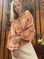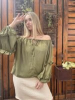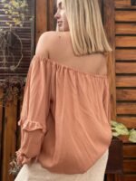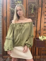 BLUSA FRANCIA ALMA BRAVA, CONFECCIONADA EN LINO SUAVE Y LIGERO COMBINA FRESCURA Y ROMANTICISMO, COMBINA FRESCURA Y ROMANTICISMO. SU DISEÑO DE ESCOTE TIPO OFF SHOULDER CON LAZO AJUSTABLE, MANGAS ABULLONADAS CON VOLADOS.