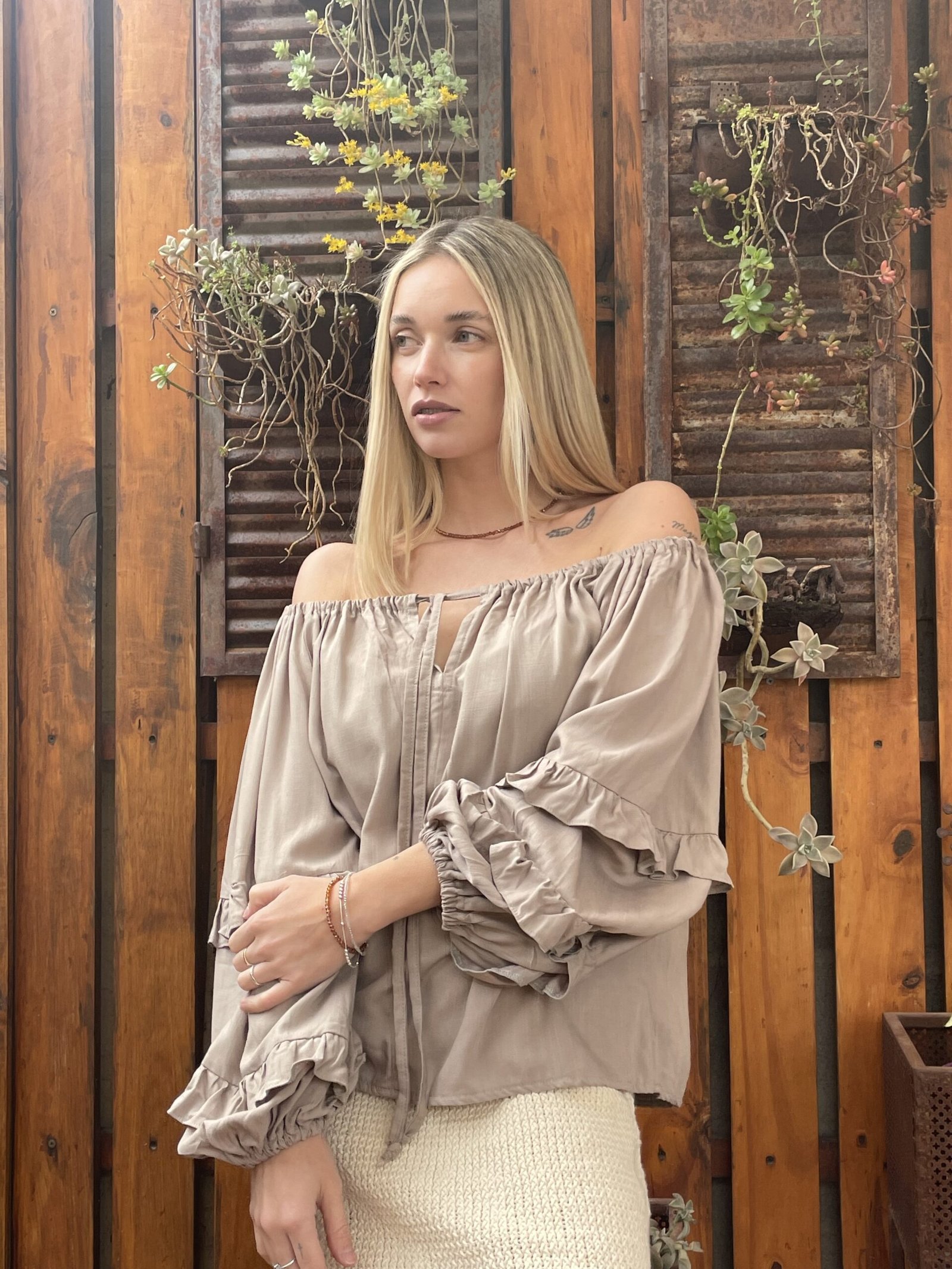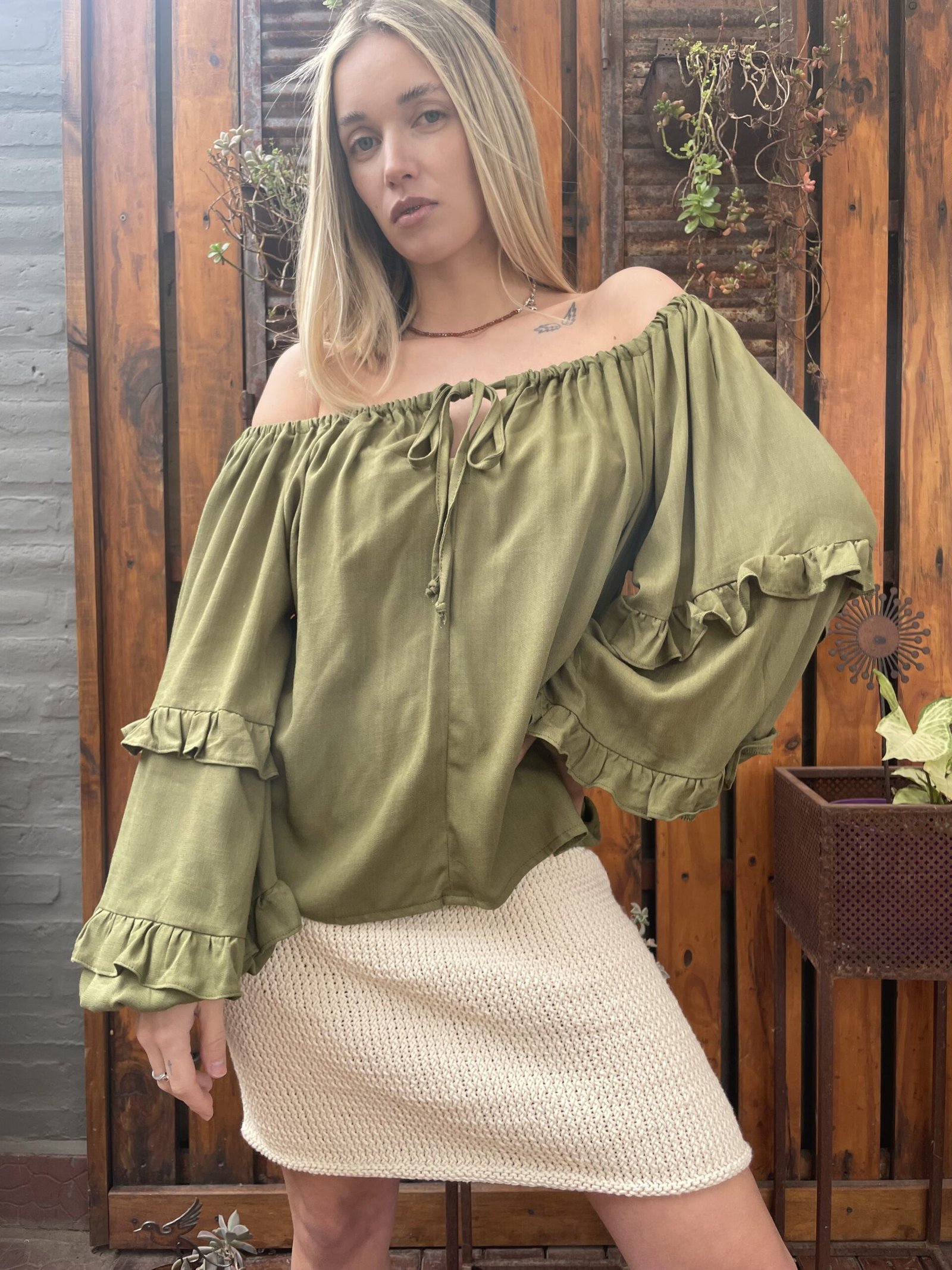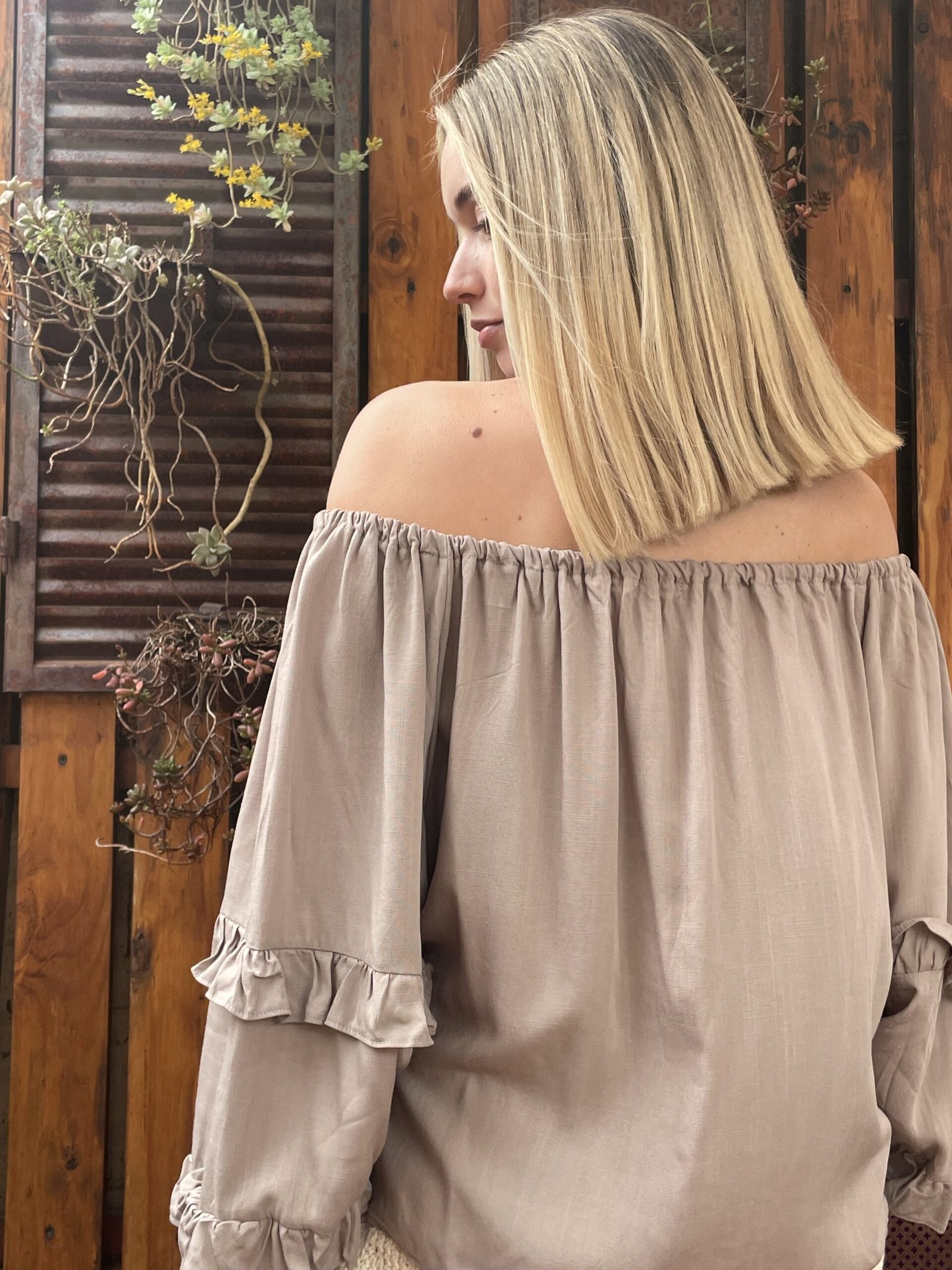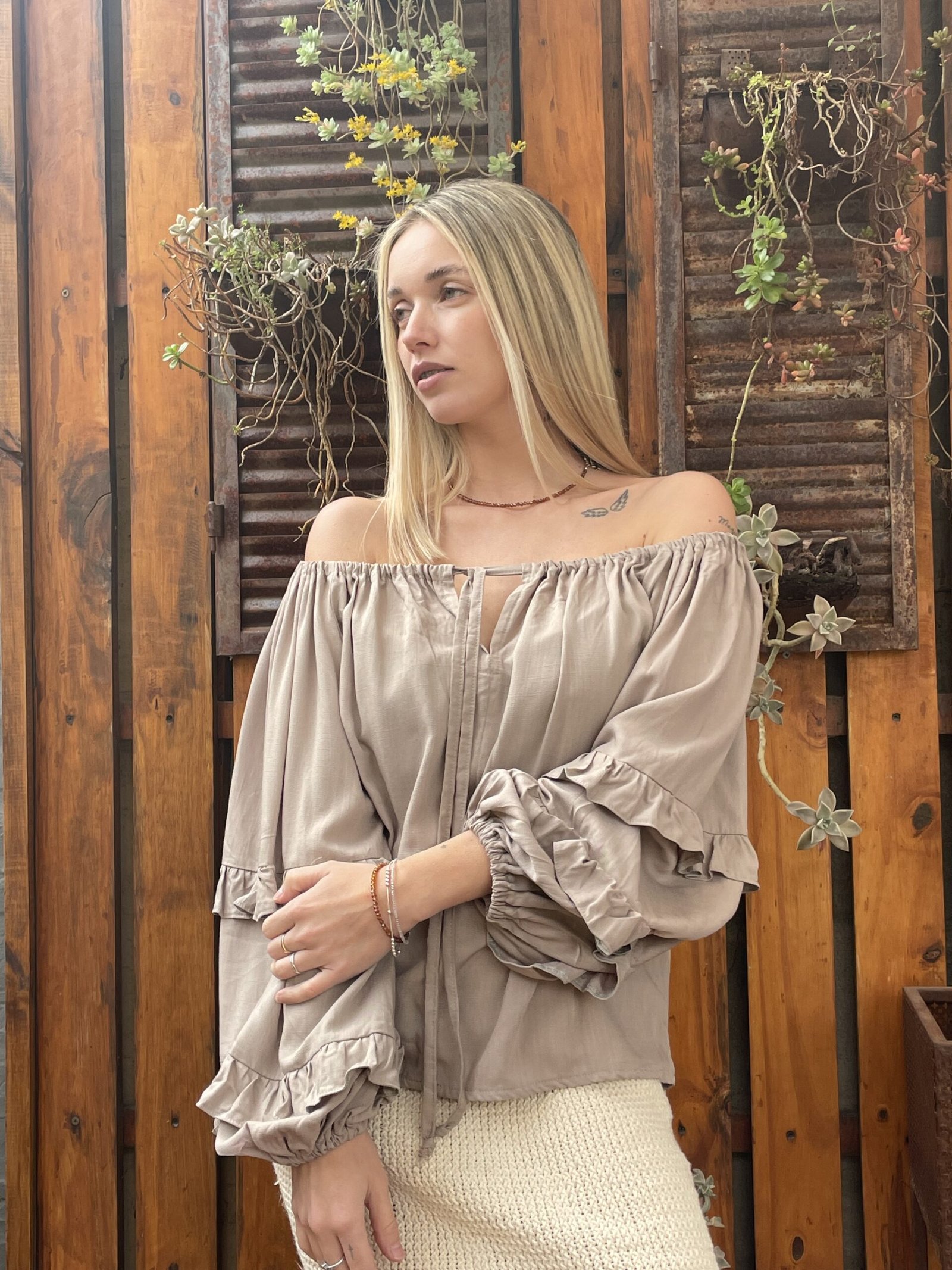 BLUSA FRANCIA ALMA BRAVA, CONFECCIONADA EN LINO SUAVE Y LIGERO COMBINA FRESCURA Y ROMANTICISMO, COMBINA FRESCURA Y ROMANTICISMO. SU DISEÑO DE ESCOTE TIPO OFF SHOULDER CON LAZO AJUSTABLE, MANGAS ABULLONADAS CON VOLADOS.