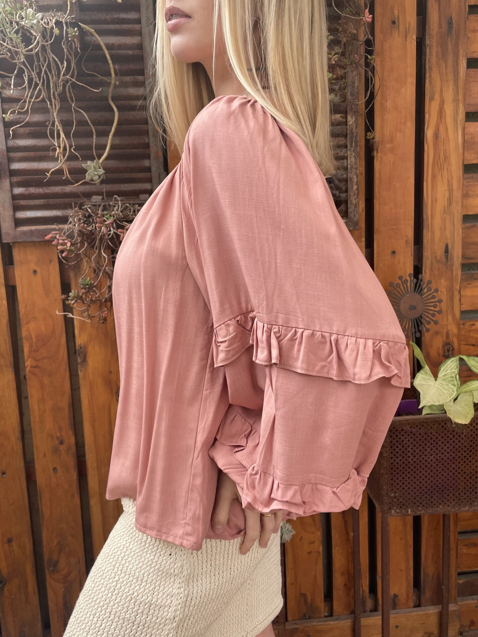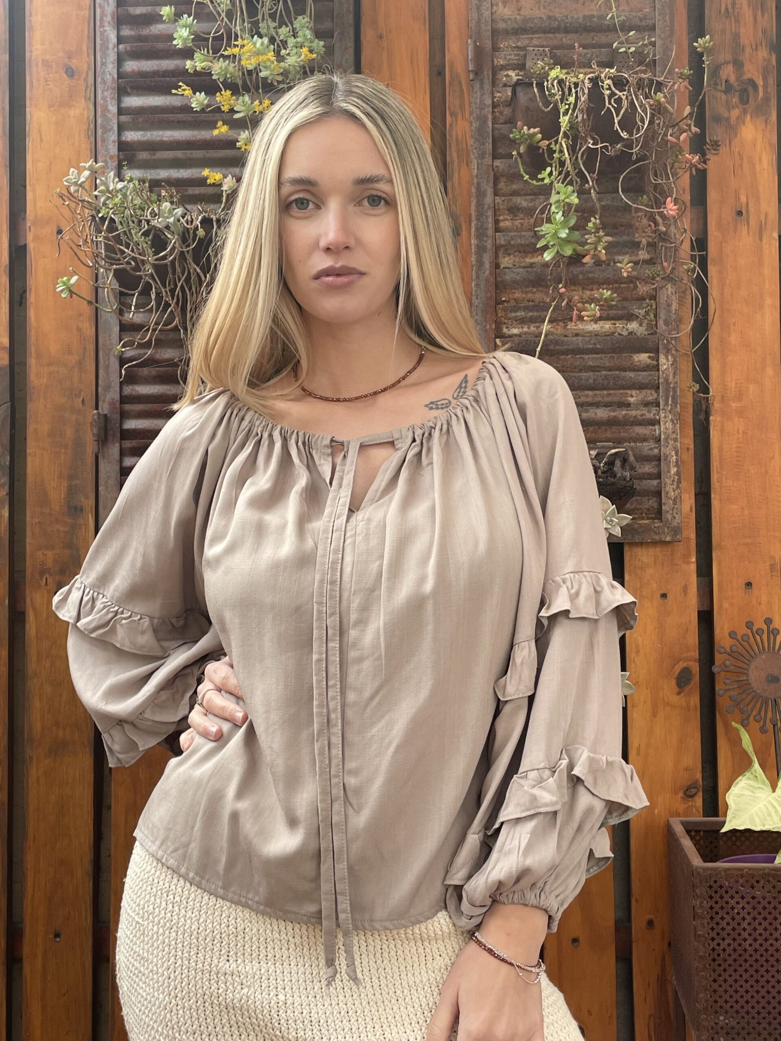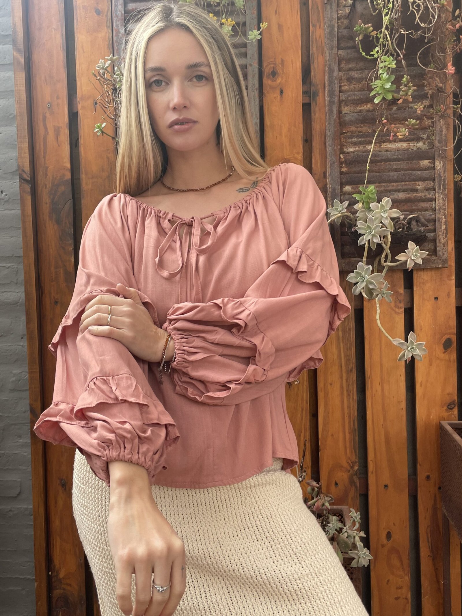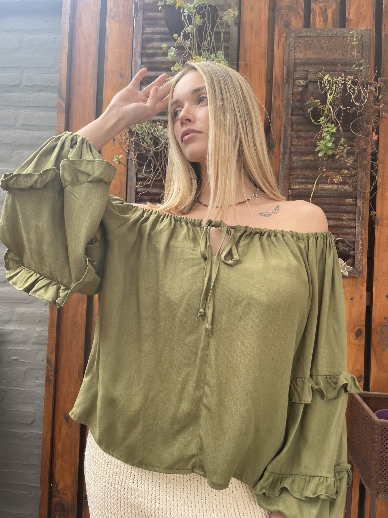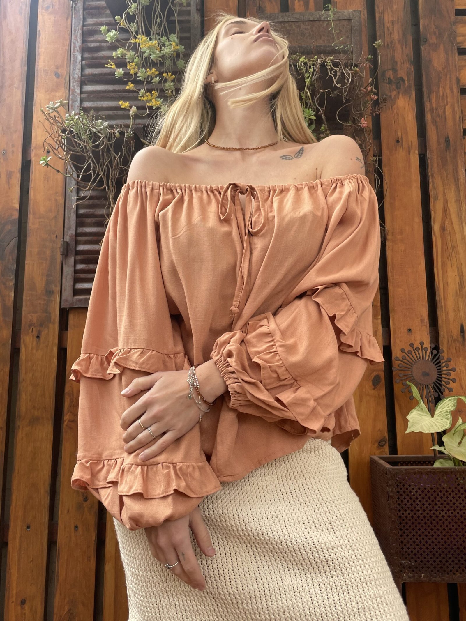 BLUSA FRANCIA ALMA BRAVA, CONFECCIONADA EN LINO SUAVE Y LIGERO COMBINA FRESCURA Y ROMANTICISMO, COMBINA FRESCURA Y ROMANTICISMO. SU DISEÑO DE ESCOTE TIPO OFF SHOULDER CON LAZO AJUSTABLE, MANGAS ABULLONADAS CON VOLADOS.