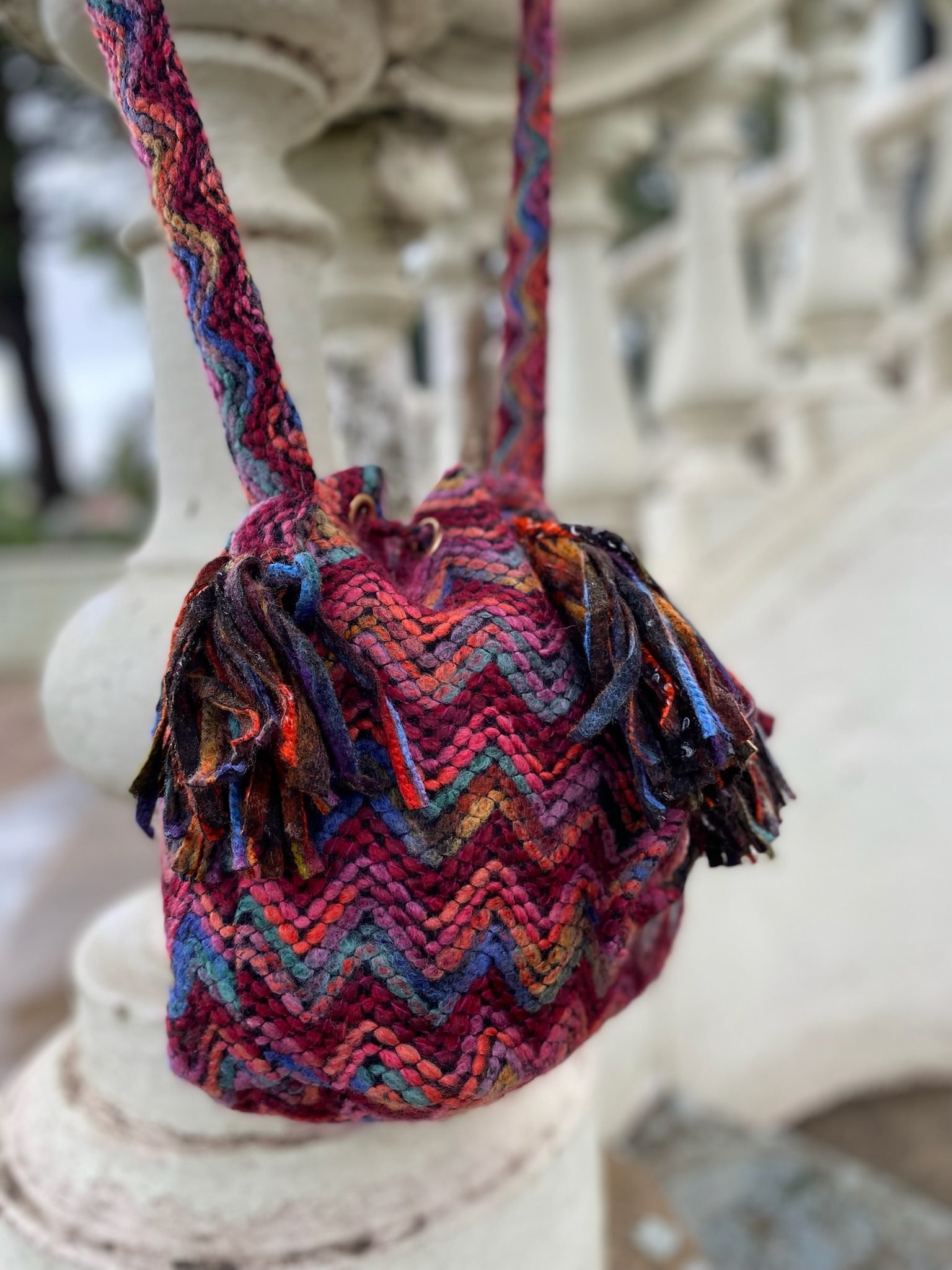 BOLSO MEDIANO TEJIDO AL TELAR. CON CIERRE Y CORREA DE LANA, DISEÑO ORIGINAL, PRÁCTICO Y MUY COMBINABLE.