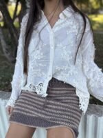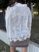 CAMISA DE GASA ENTERAMENTE BORDADA CON TERMINACIONES EN EL CUERPO Y MANGAS DE PUNTILLAS, ACENTUANDO EL ESTILO LA MODELO ES TALLE S