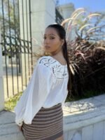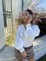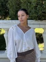 CAMISA ESCOTE EN V CON PUNTILLA DE ALGODÓN EN EL PUÑO Y LOS HOMBROS. EXCELENTE, PRÁCTICA Y CANCHERA LA MODELO ES TALLE S