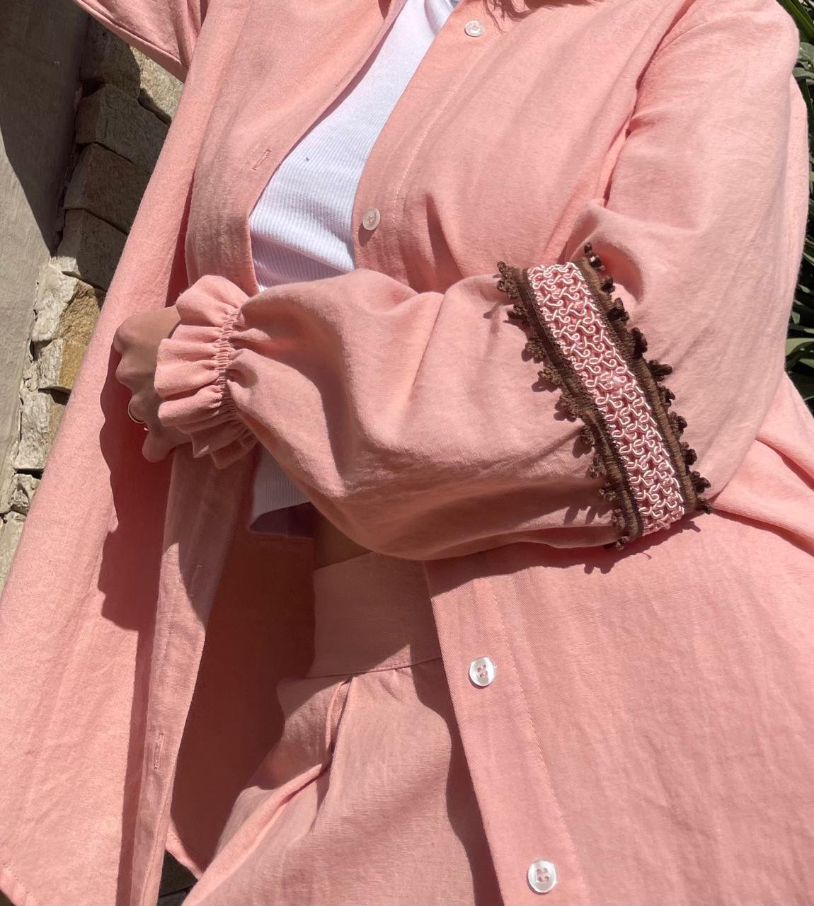CAMISA MARRUECOS ROSA VIEJO CON MANGAS CON BORDADO COLOR CHOCOLATE. PERFECTO PARA PORYECTAR TU PERSONALIDAD Y SENTIRTE CÓMODA.