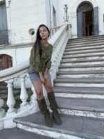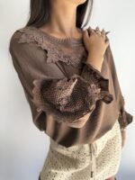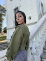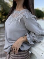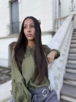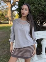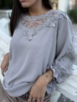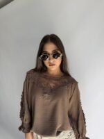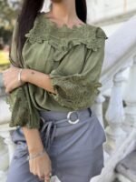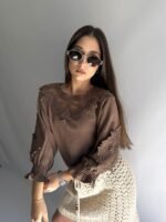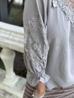 CAMISA CON EXCELENTE CAÍDA CON APLIQUES BOHEMIOS BORDADOS, MANGAS CON ELÁSTICO QUE SIMULA VUELO LA MODELO ES TALLE S