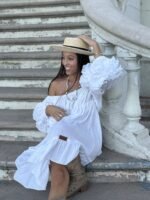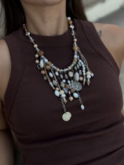 COLLAR TRES VUELTAS DE PIEDRAS, MADERA Y DETALLES DE METAL EN TONOS BEIGE Y BLANCO.