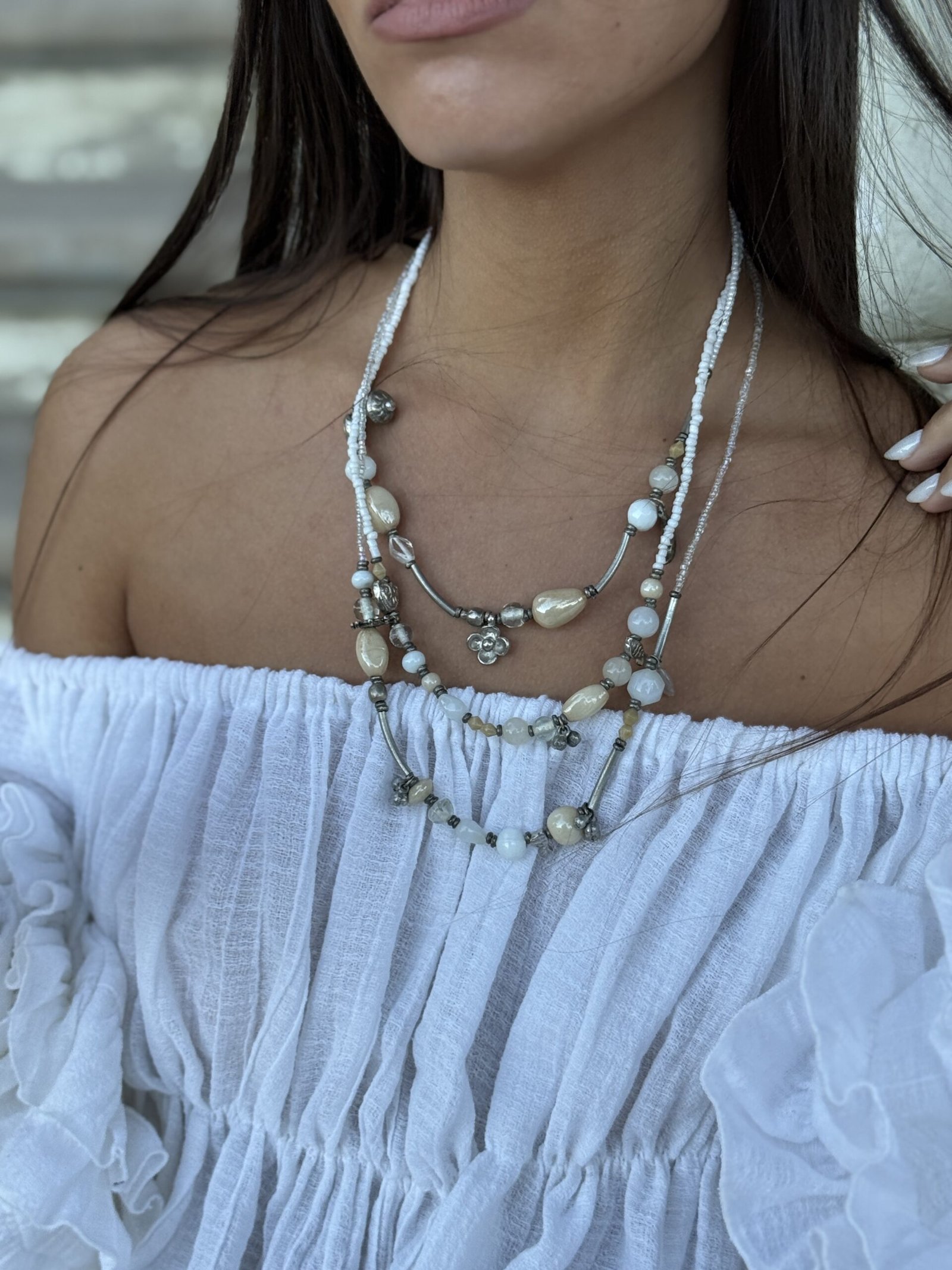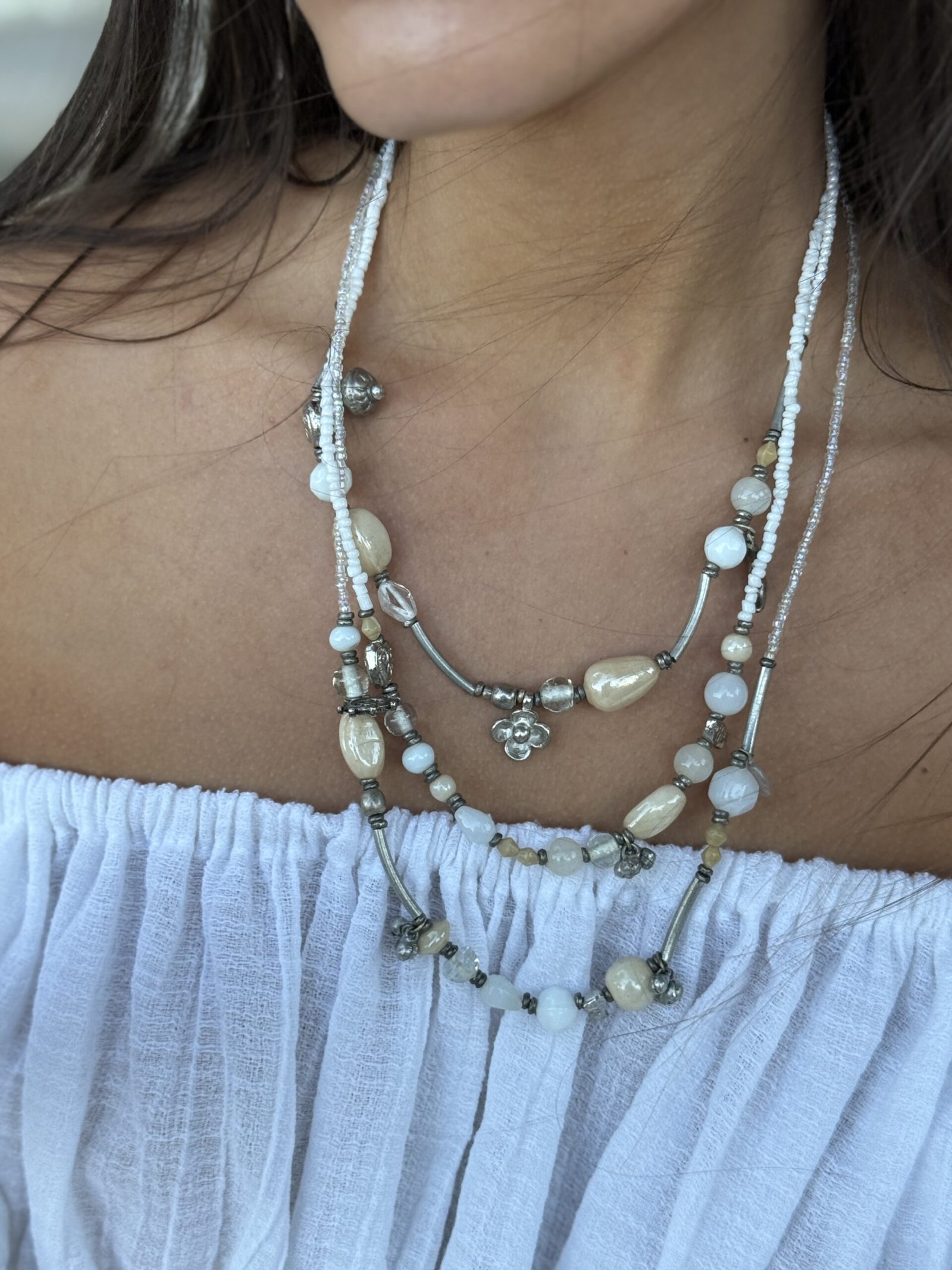 COLLAR TRES VUELTAS DE PIEDRAS, MADERA Y DETALLES DE METAL EN TONOS BEIGE Y BLANCO.