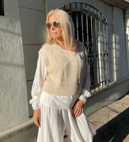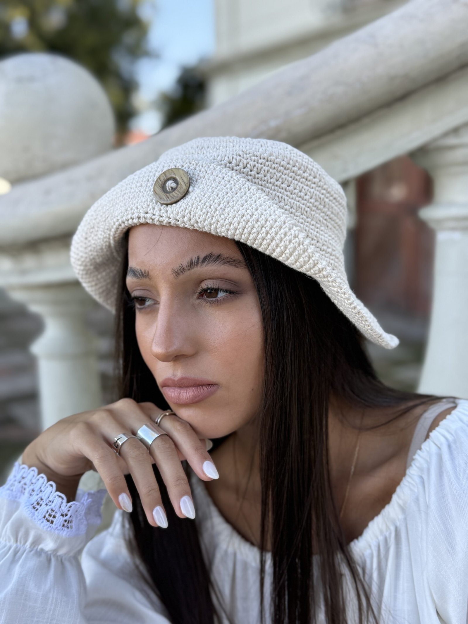 PILUSO DE HILO TEJIDO A MANO CON UN BOTÓN PARA LLEVAR COMO MÁS TE GUSTE AL FRENTE O ATRÁS. MARCANDO DIFERENCIA Y DISTINCIÓN.LA MODELO ES TALLE S