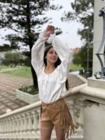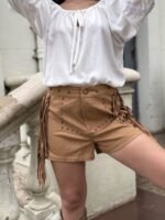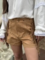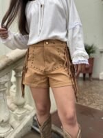 SHORTS DE GAMUZA CON FLECOS Y TACHAS LA MODELO ES TALLE S