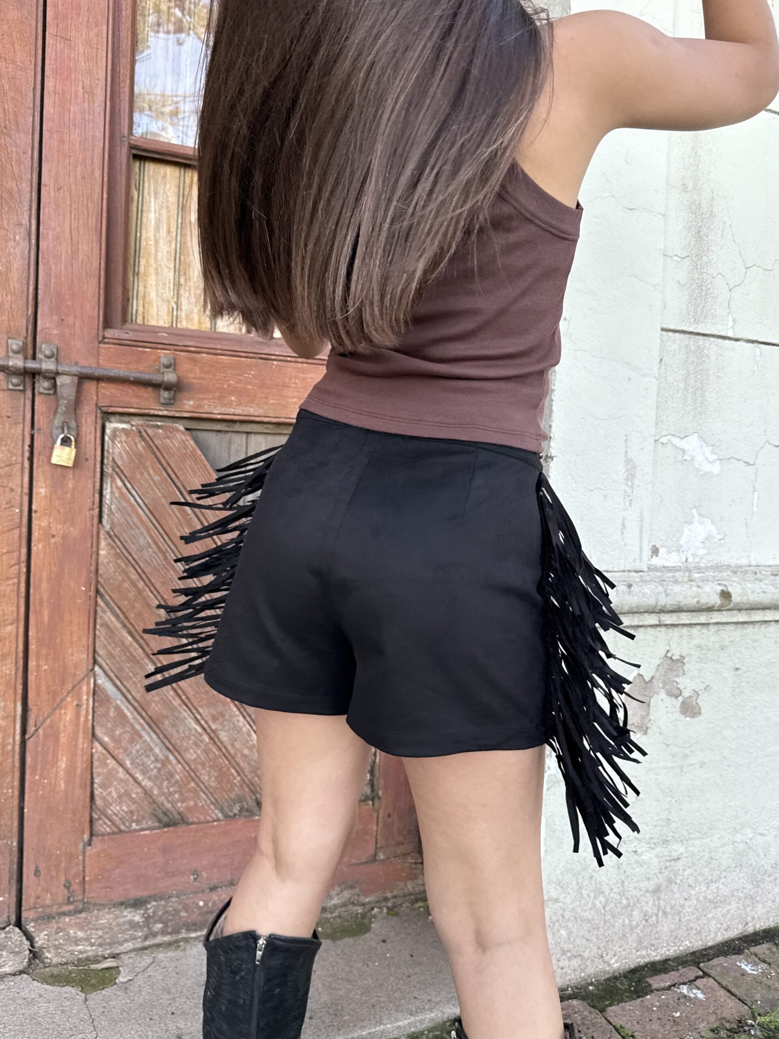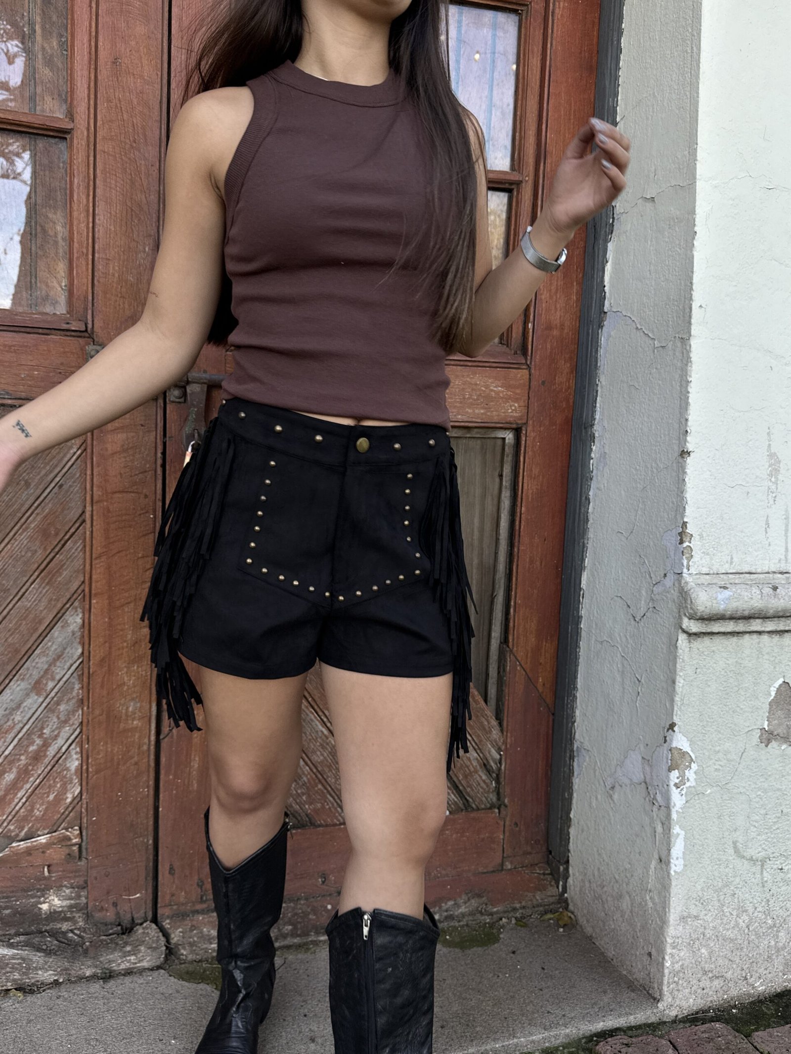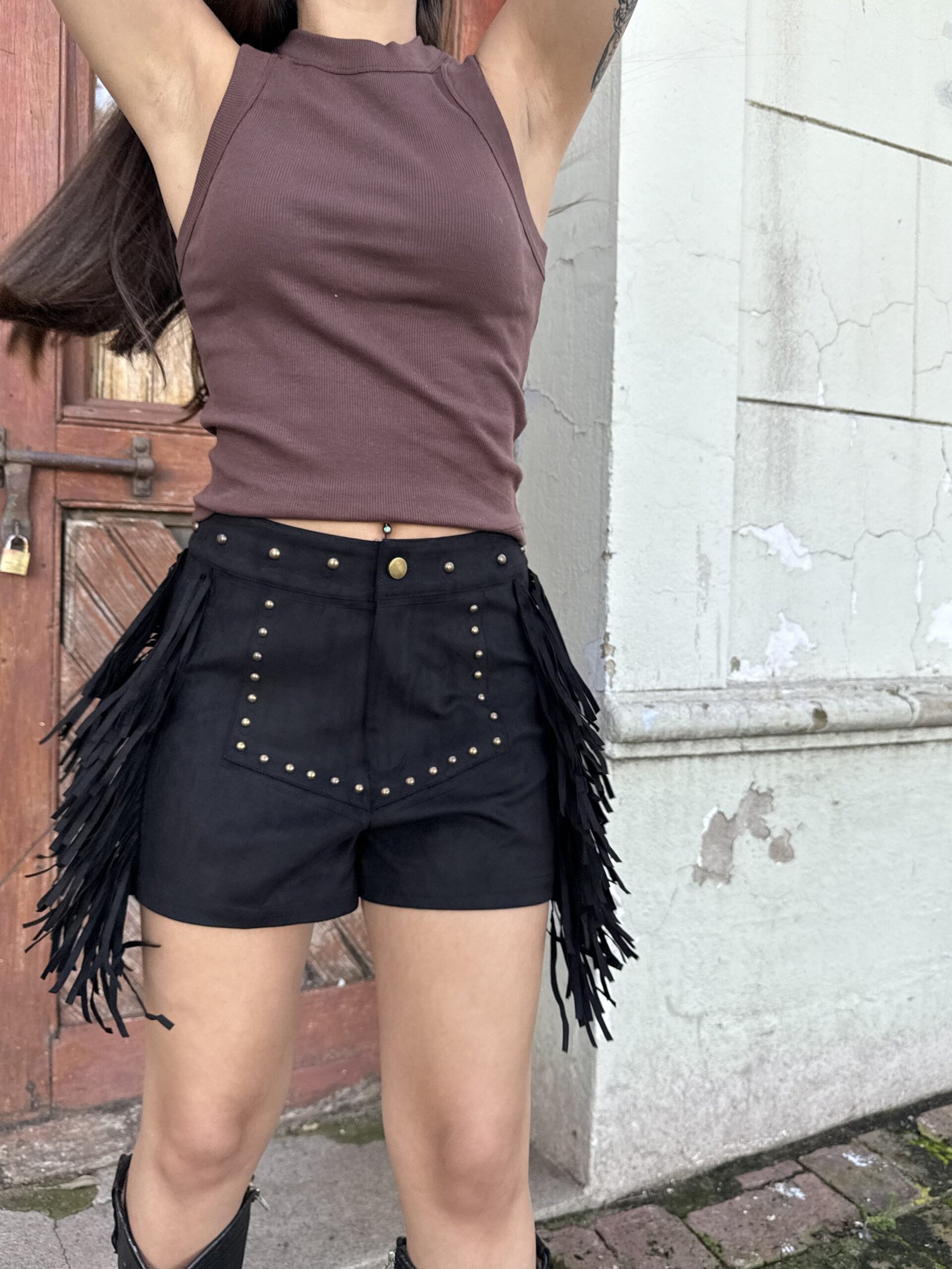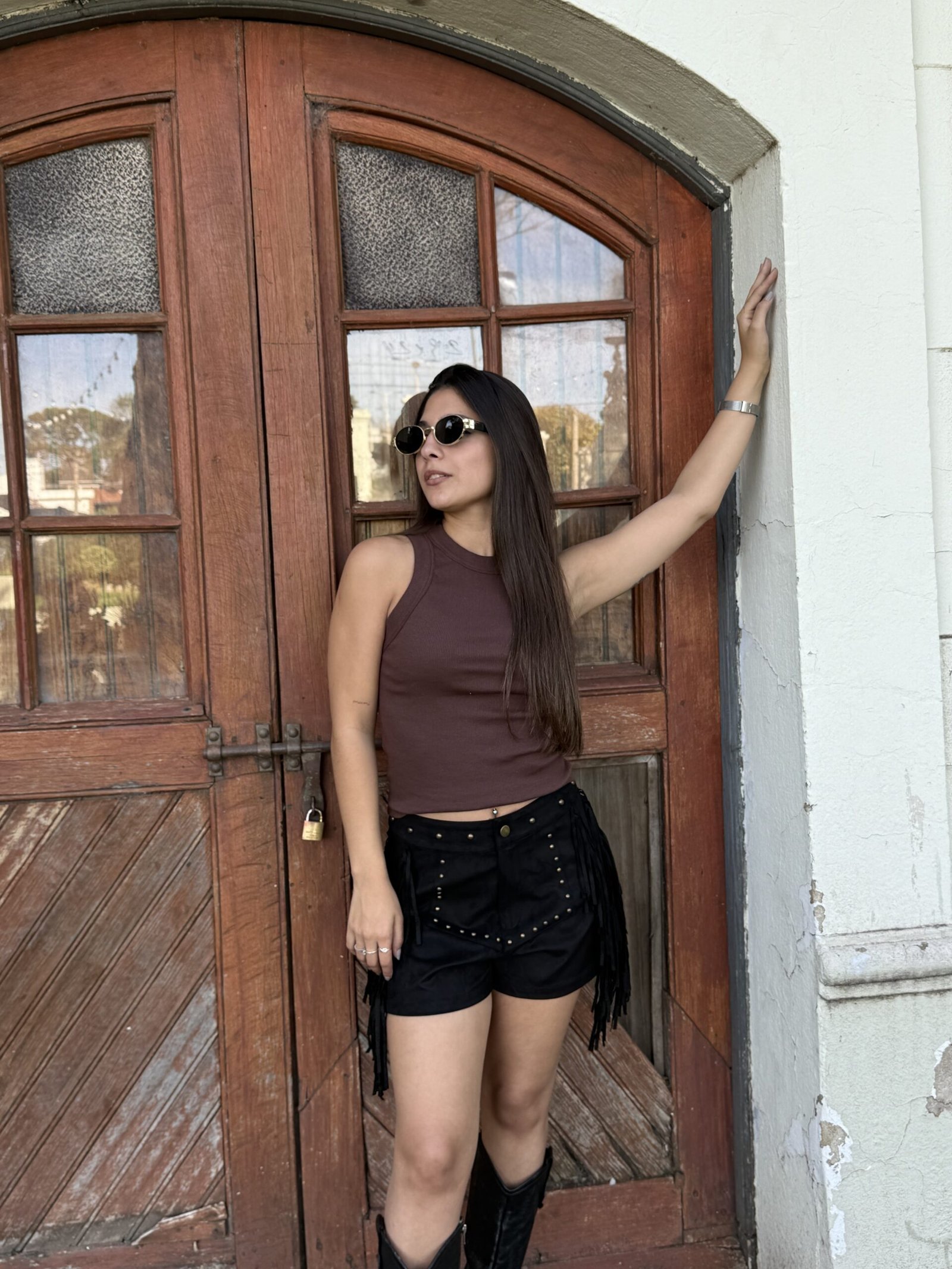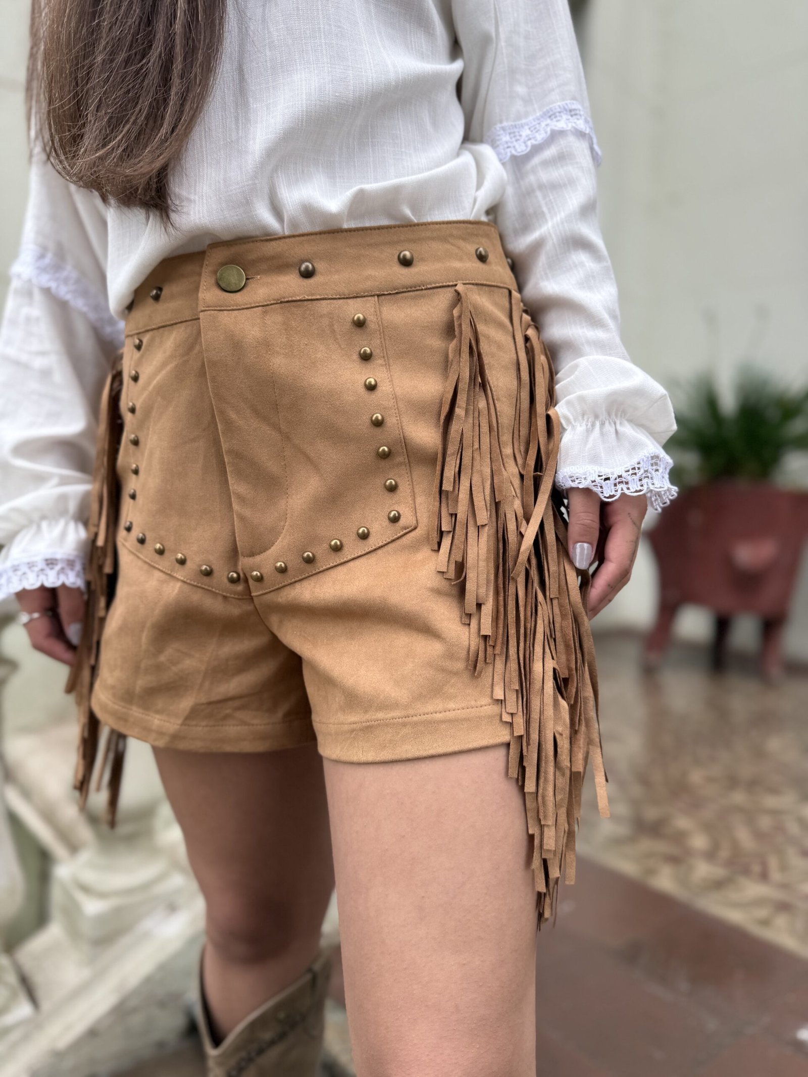 SHORTS DE GAMUZA CON FLECOS Y TACHAS LA MODELO ES TALLE S