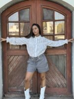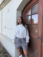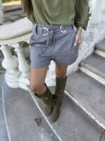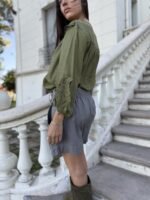 SHORT DE LINO ATEMPORAL CON FRENTE PLANO Y DOS APLIQUES QUE LO HACEN ESPECIAL. UNIDOS A UN LAZO QUE DA AJUSTE, CON CINTURA ELÁSTICA ATRÁS PARA UN CALCE CÓMODO Y CON ESTILO PARTICULAR LA MODELO ES TALLE S – CINTURA SIN ESTIRAR 78 CM , CINTURA ESTIRABLE 100CM