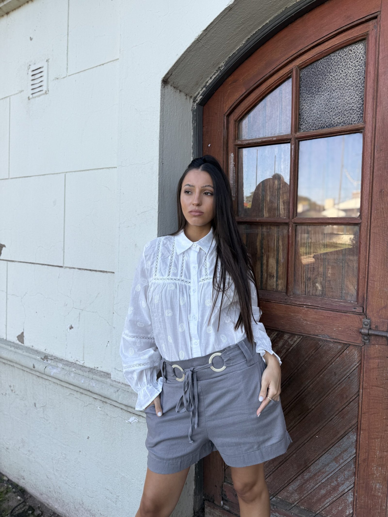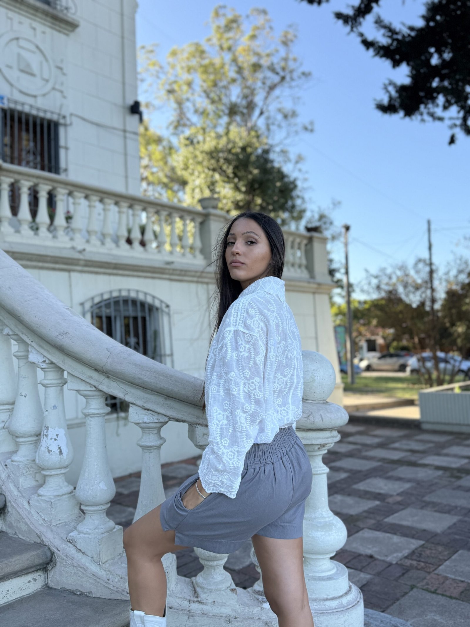SHORT DE LINO ATEMPORAL CON FRENTE PLANO Y DOS APLIQUES QUE LO HACEN ESPECIAL. UNIDOS A UN LAZO QUE DA AJUSTE, CON CINTURA ELÁSTICA ATRÁS PARA UN CALCE CÓMODO Y CON ESTILO PARTICULAR LA MODELO ES TALLE S – CINTURA SIN ESTIRAR 78 CM , CINTURA ESTIRABLE 100CM