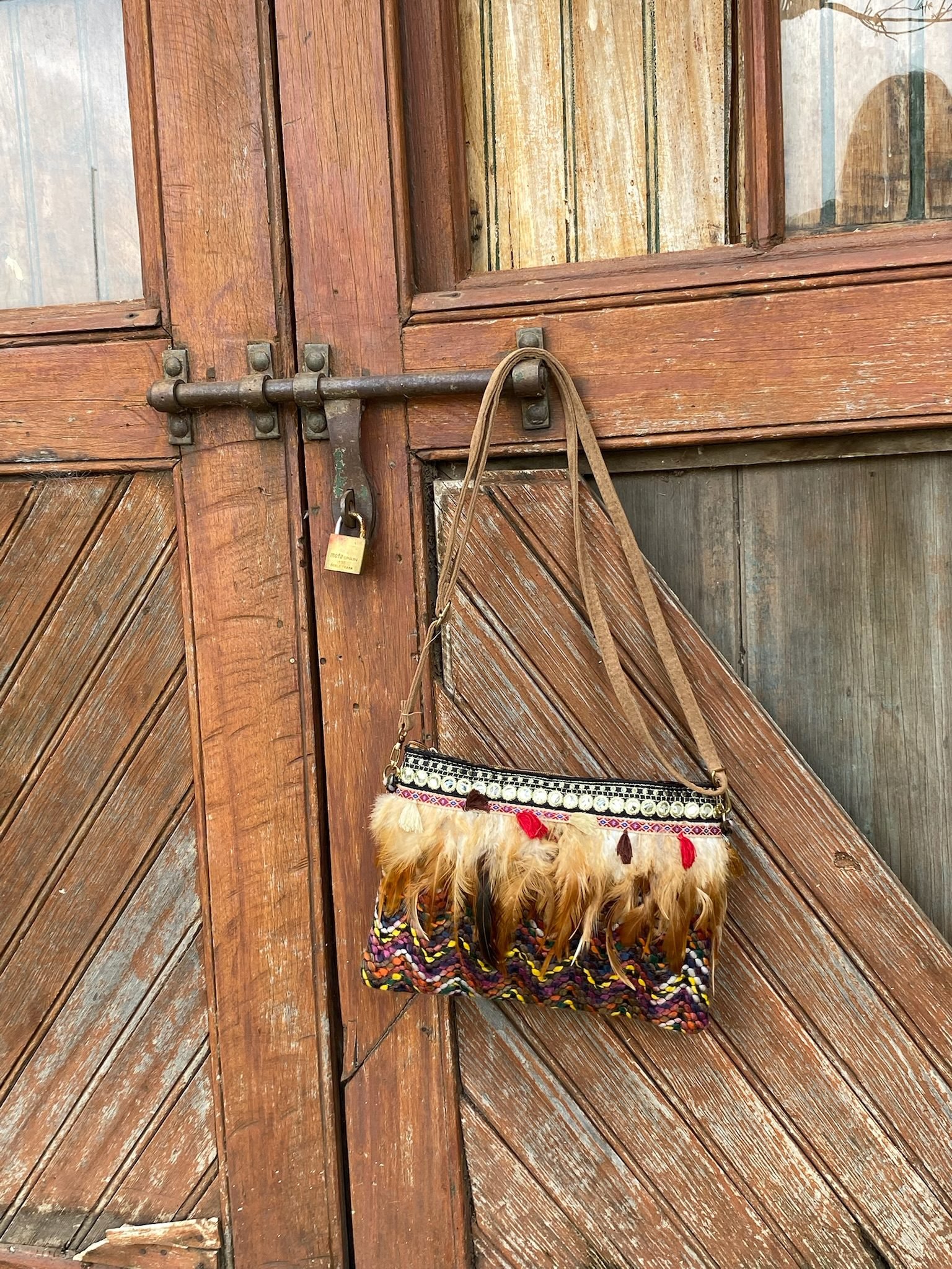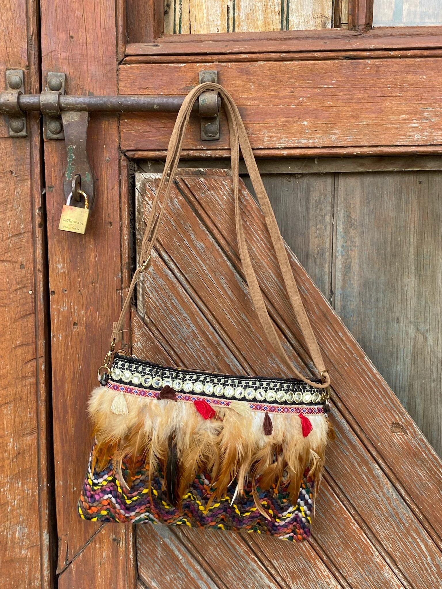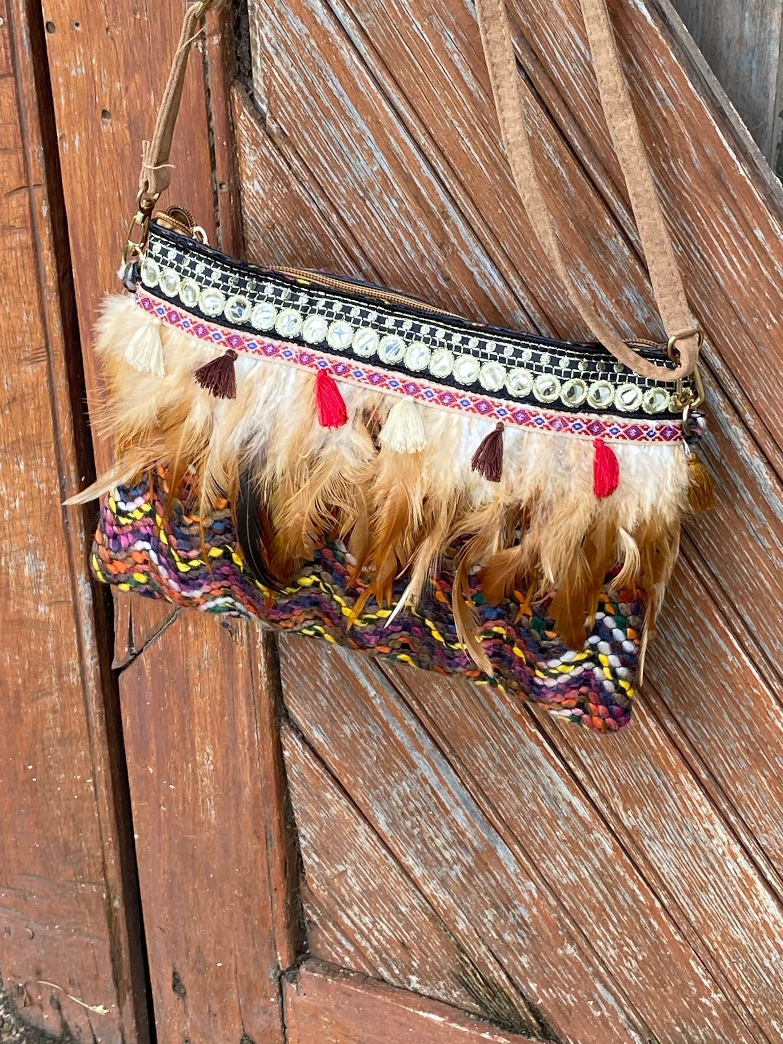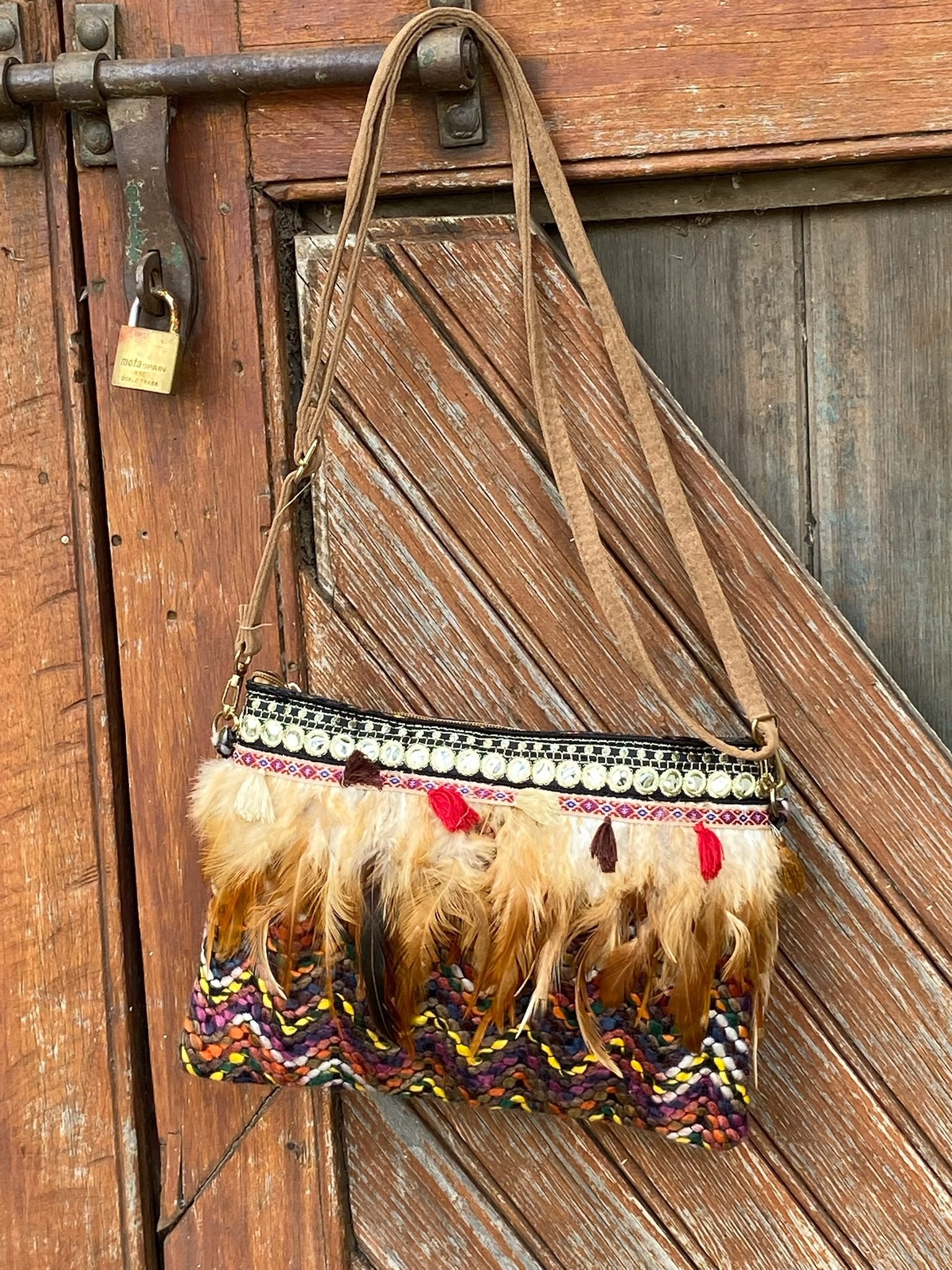 SOBRE TEJIDO CON CIERRE Y CORREA, COMBINA TEXTURA, PLUMAS Y BRILLOS SUTILES PARA SUMAR PERSONALIDAD Y ENCANTO.