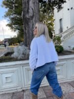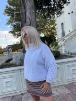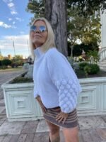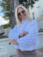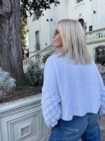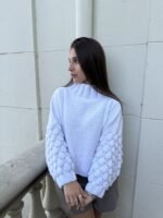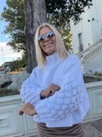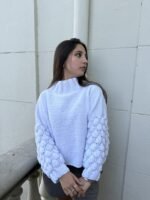SWEATER DE HILO PESADO PARA INVIERNO, ABRIGADO. CON DETALLES DE POMPAS EN LAS MANGAS, SUELTO, CUELLO ALTO LA MODELO ES TALLE S