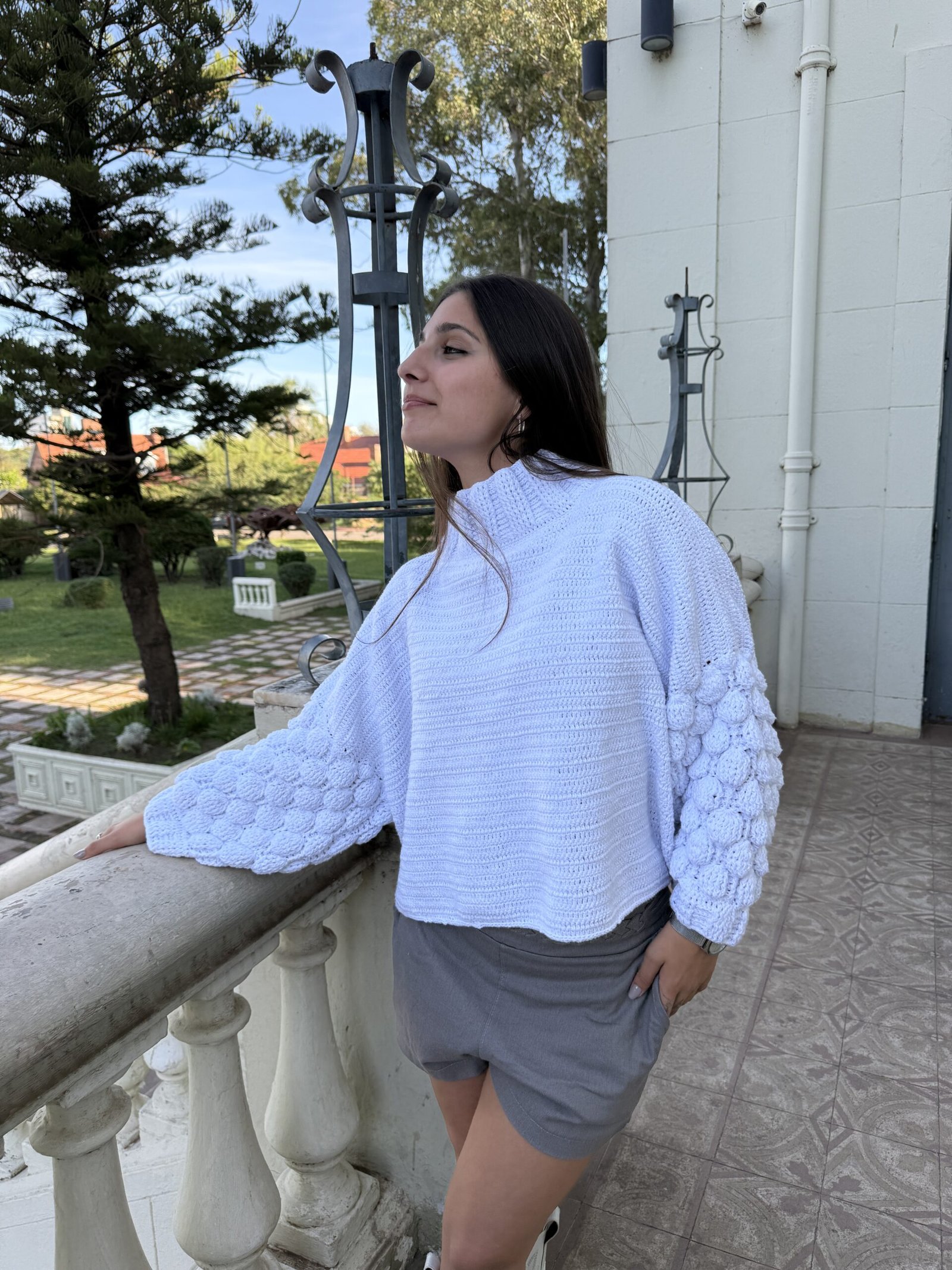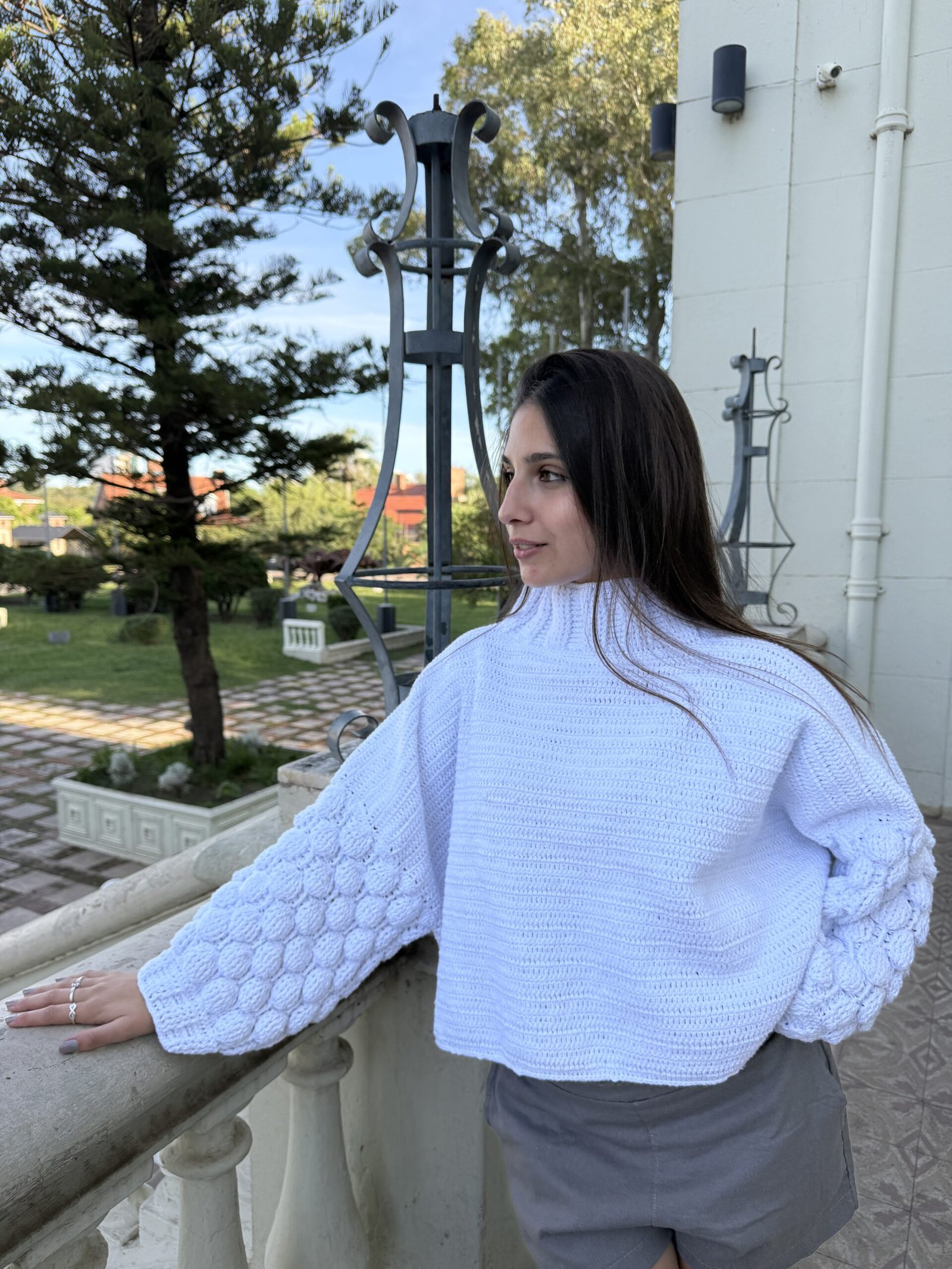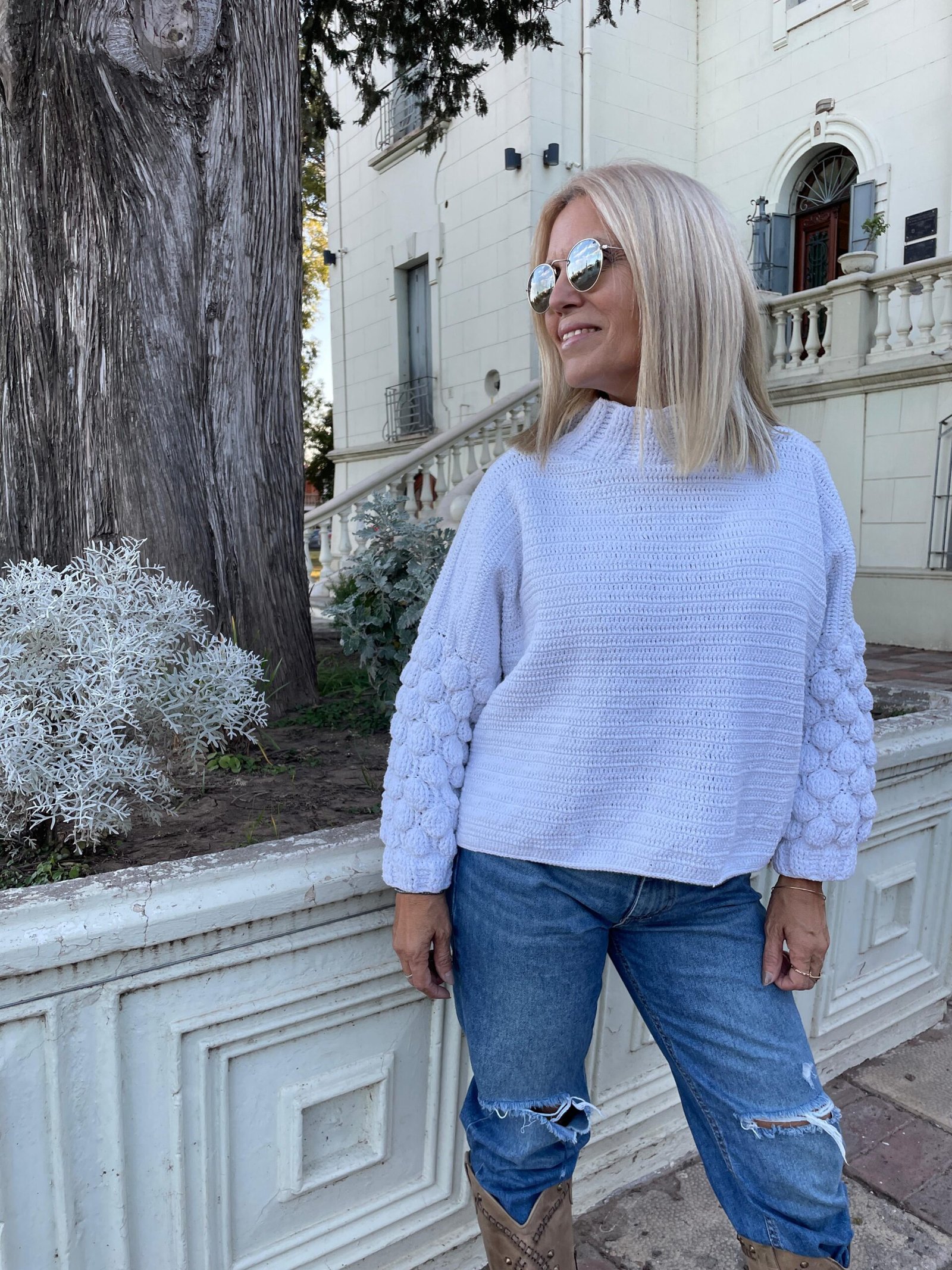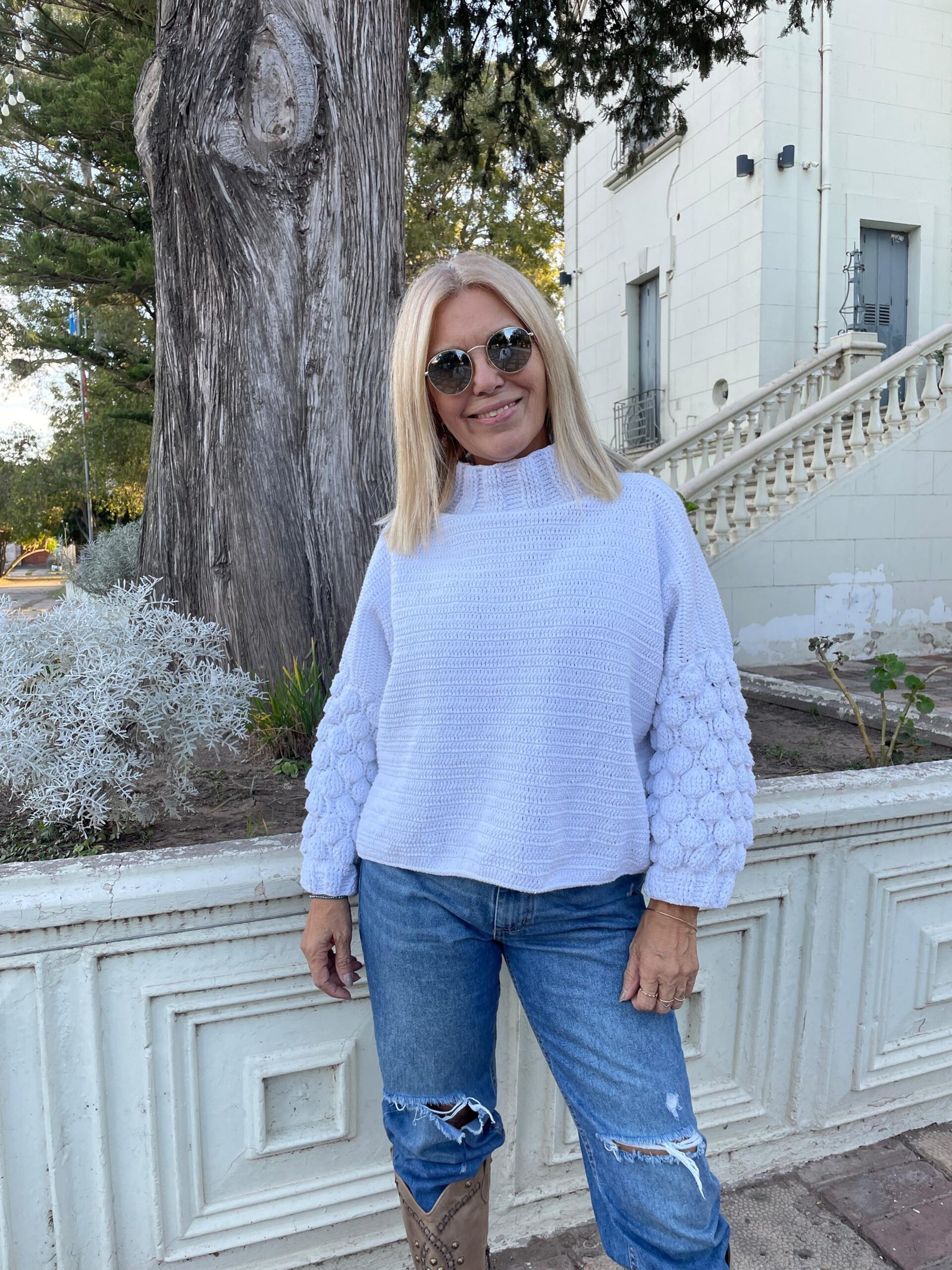 SWEATER DE HILO PESADO PARA INVIERNO, ABRIGADO. CON DETALLES DE POMPAS EN LAS MANGAS, SUELTO, CUELLO ALTO LA MODELO ES TALLE S