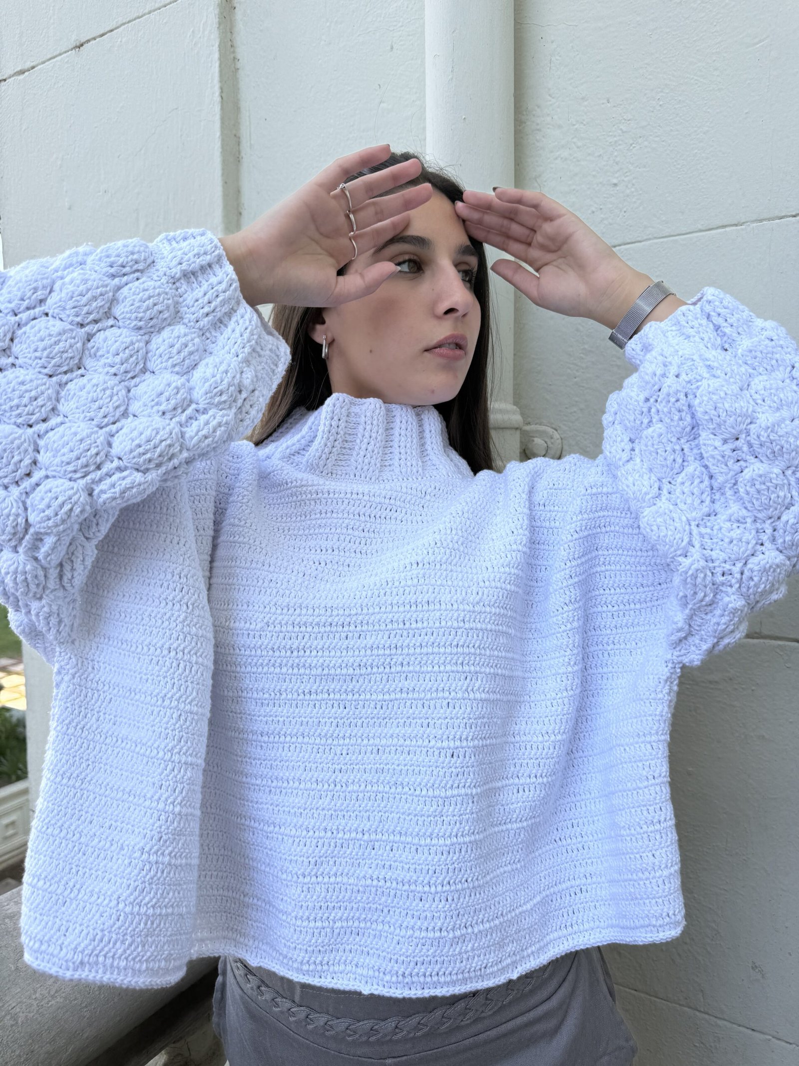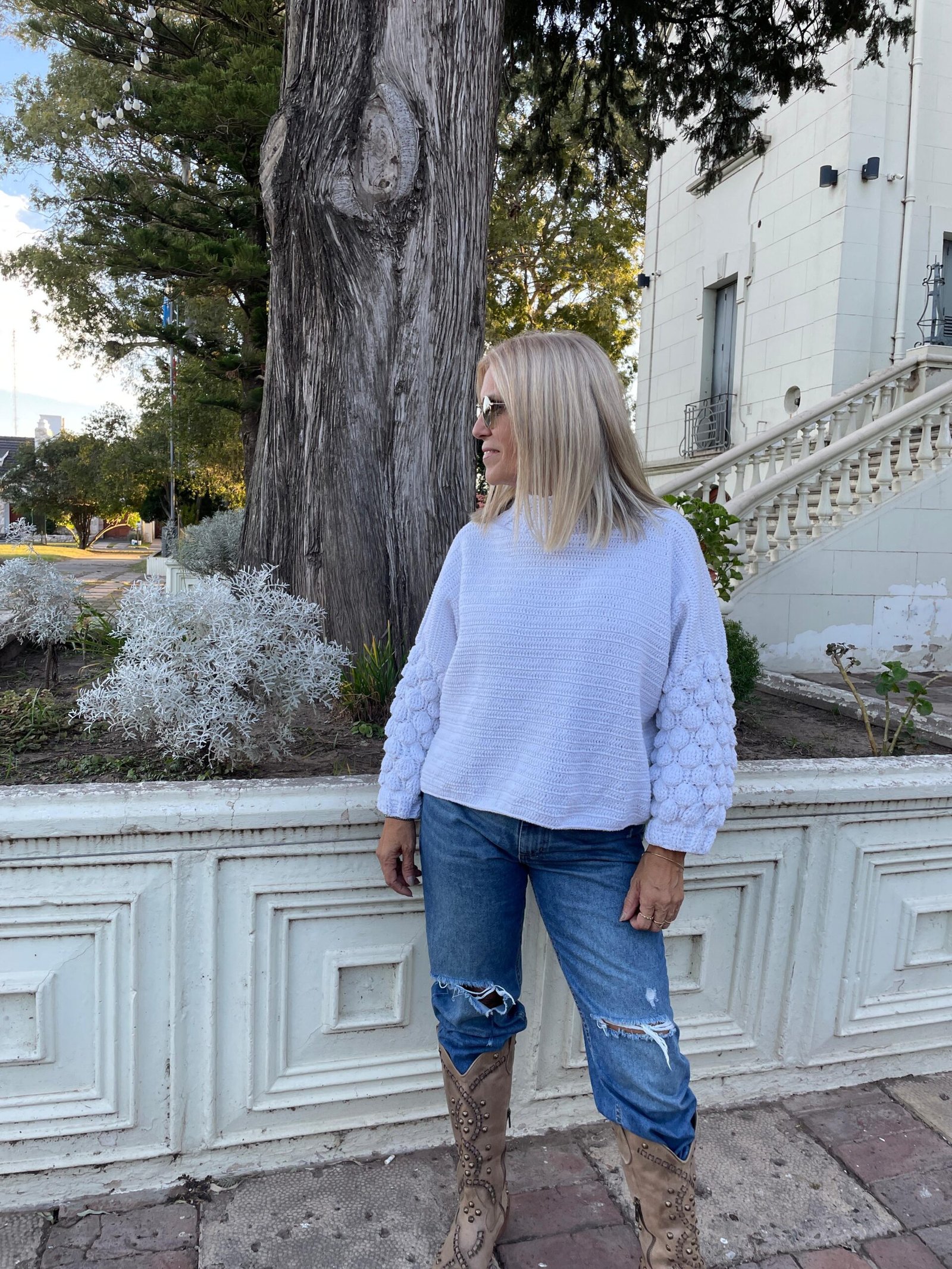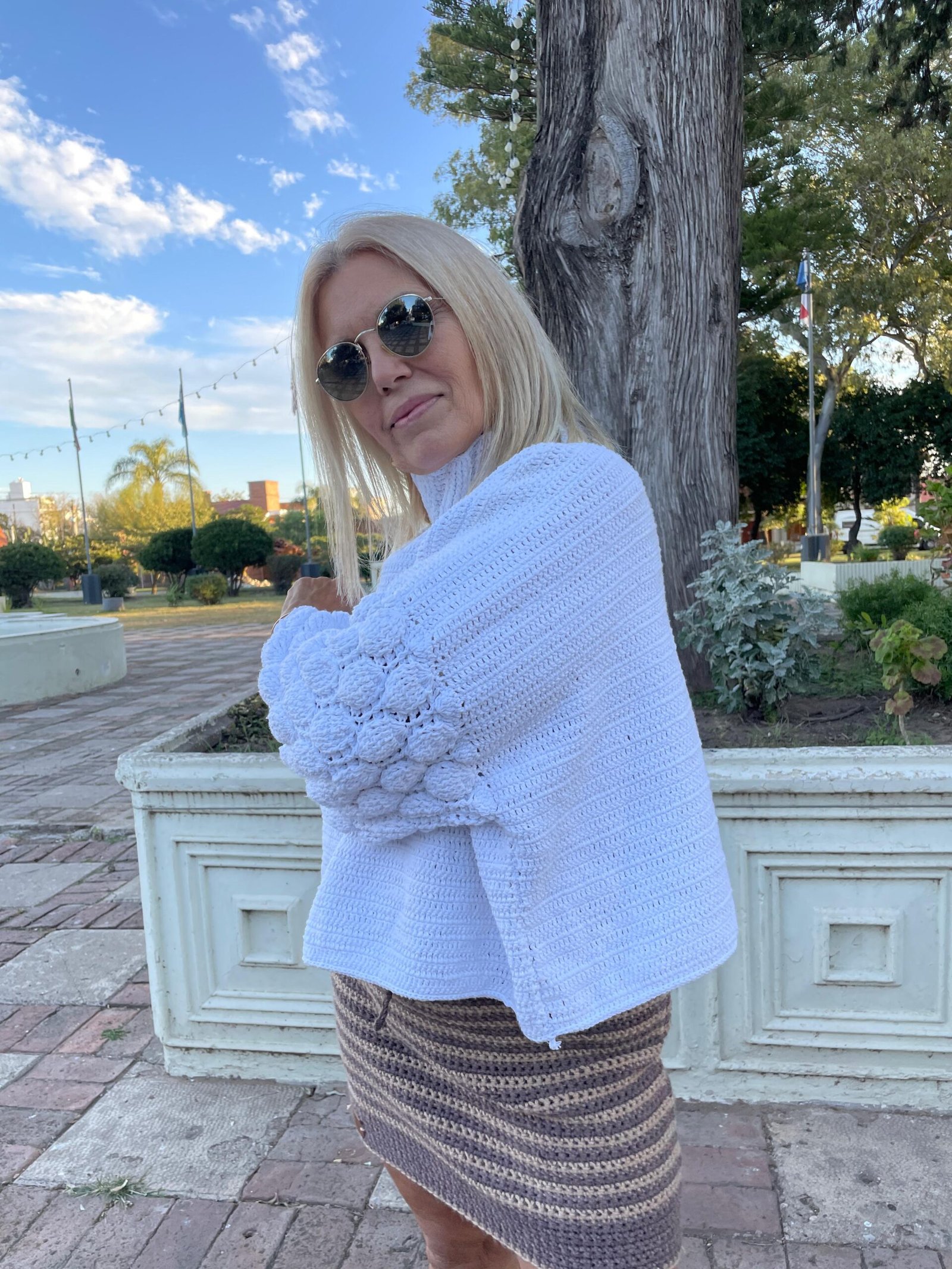 SWEATER DE HILO PESADO PARA INVIERNO, ABRIGADO. CON DETALLES DE POMPAS EN LAS MANGAS, SUELTO, CUELLO ALTO LA MODELO ES TALLE S