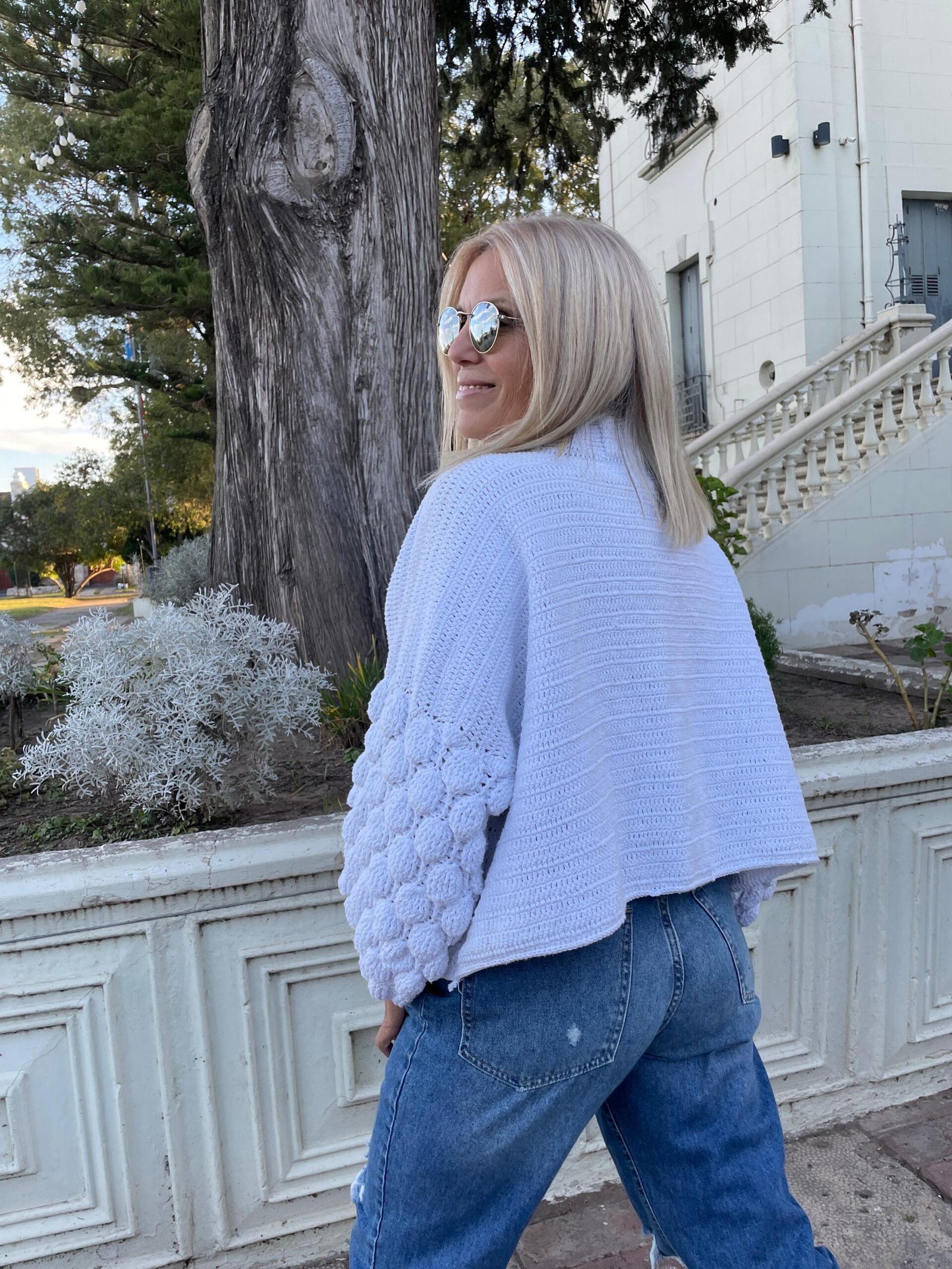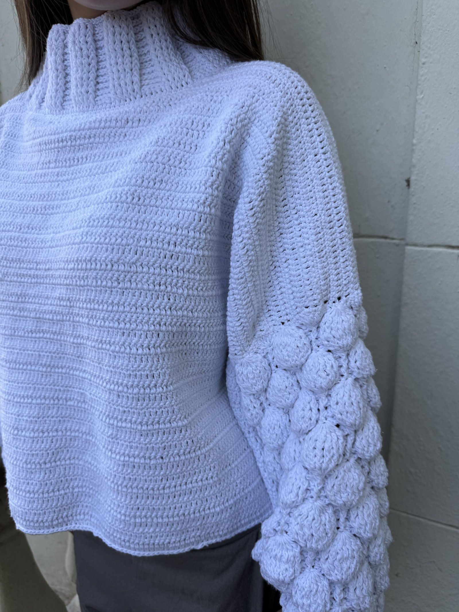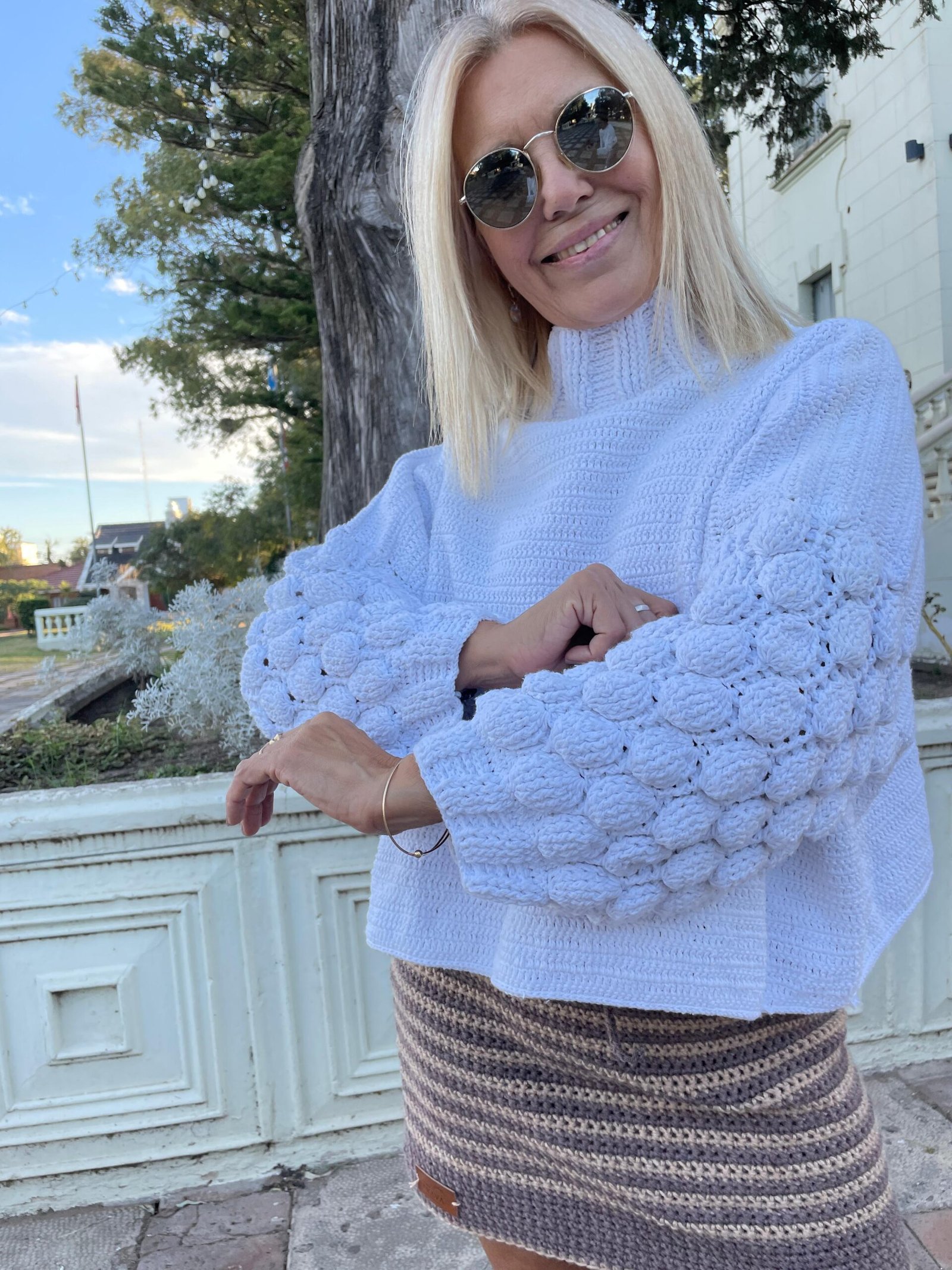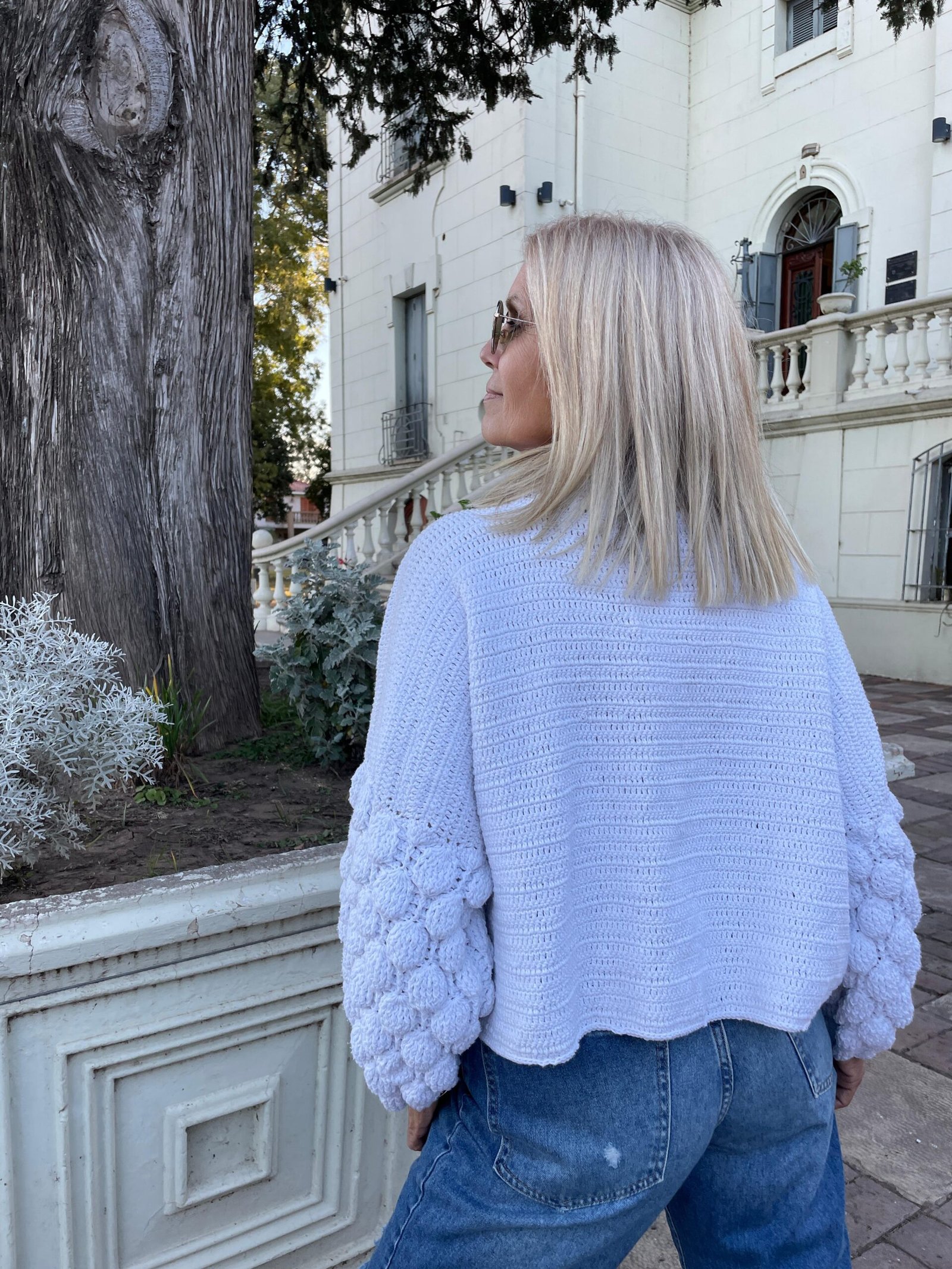 SWEATER DE HILO PESADO PARA INVIERNO, ABRIGADO. CON DETALLES DE POMPAS EN LAS MANGAS, SUELTO, CUELLO ALTO LA MODELO ES TALLE S