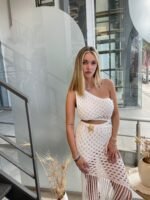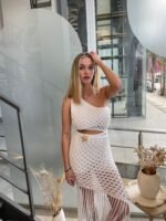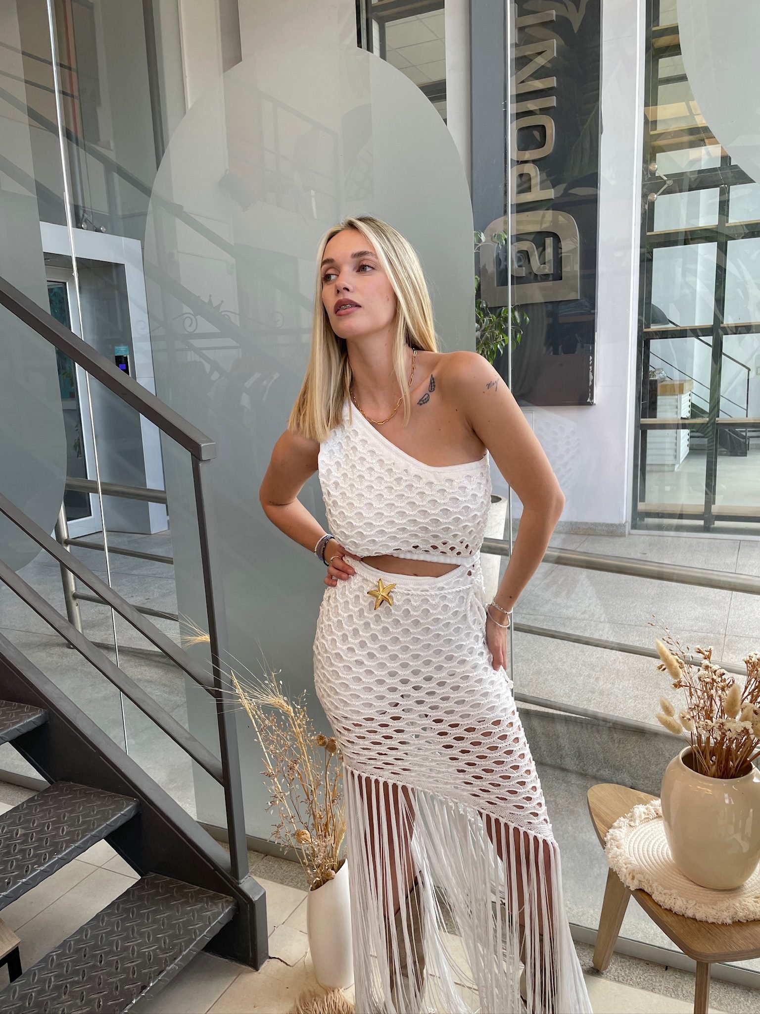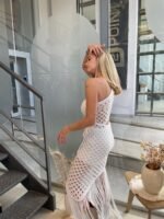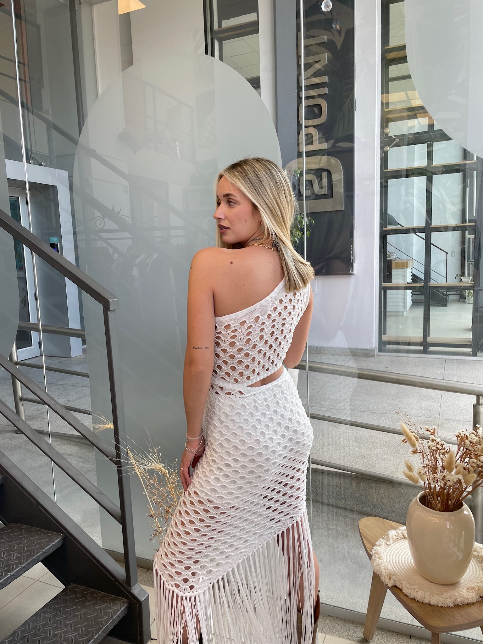 VESTIDO FRESCO TEJIDO DE HILO, CON ABERTURAS DELICADAS Y ACCESORIO COMO DETALLE CON FLECOS.