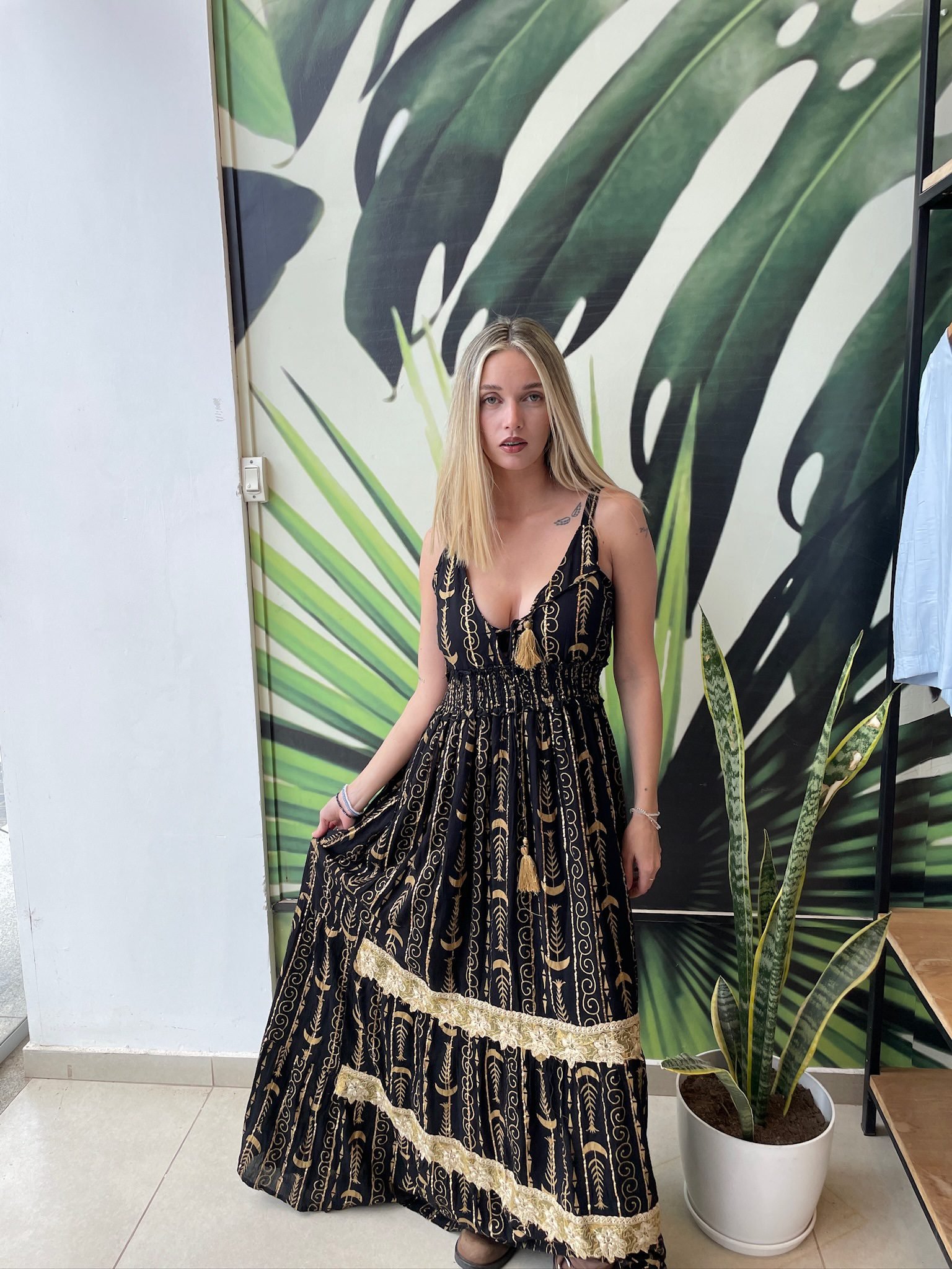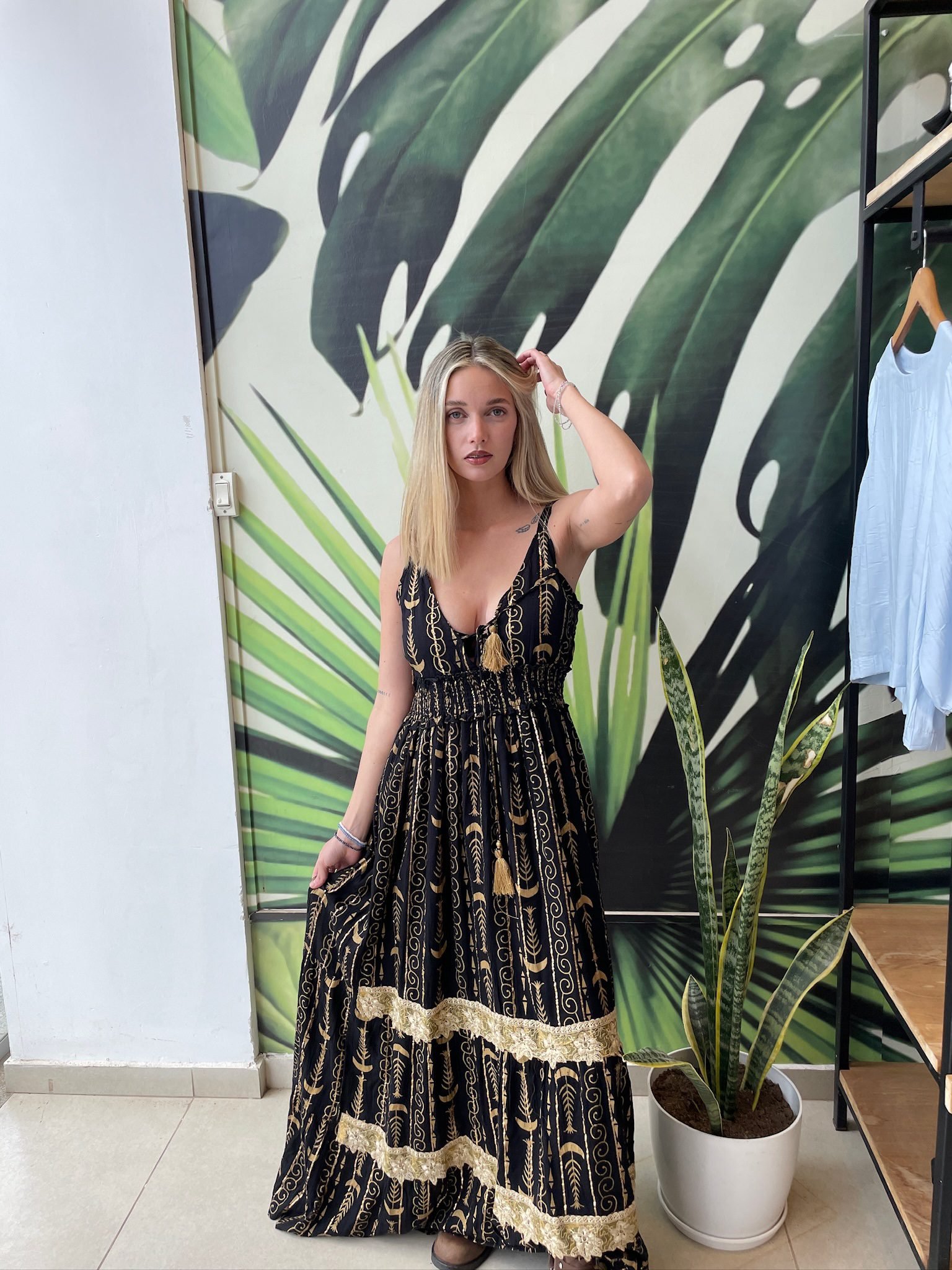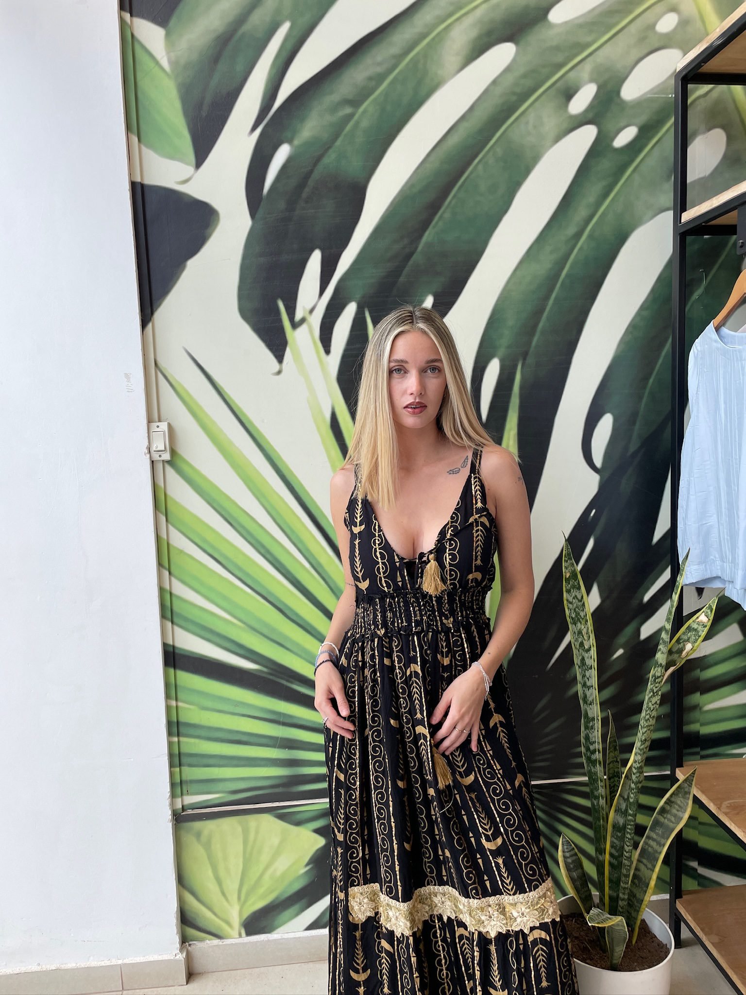 VESTIDO FRESCO CON UN ESTAMPADO ÚNICO, DETALLES BORDADOS EN DORADO Y FLECOS.