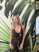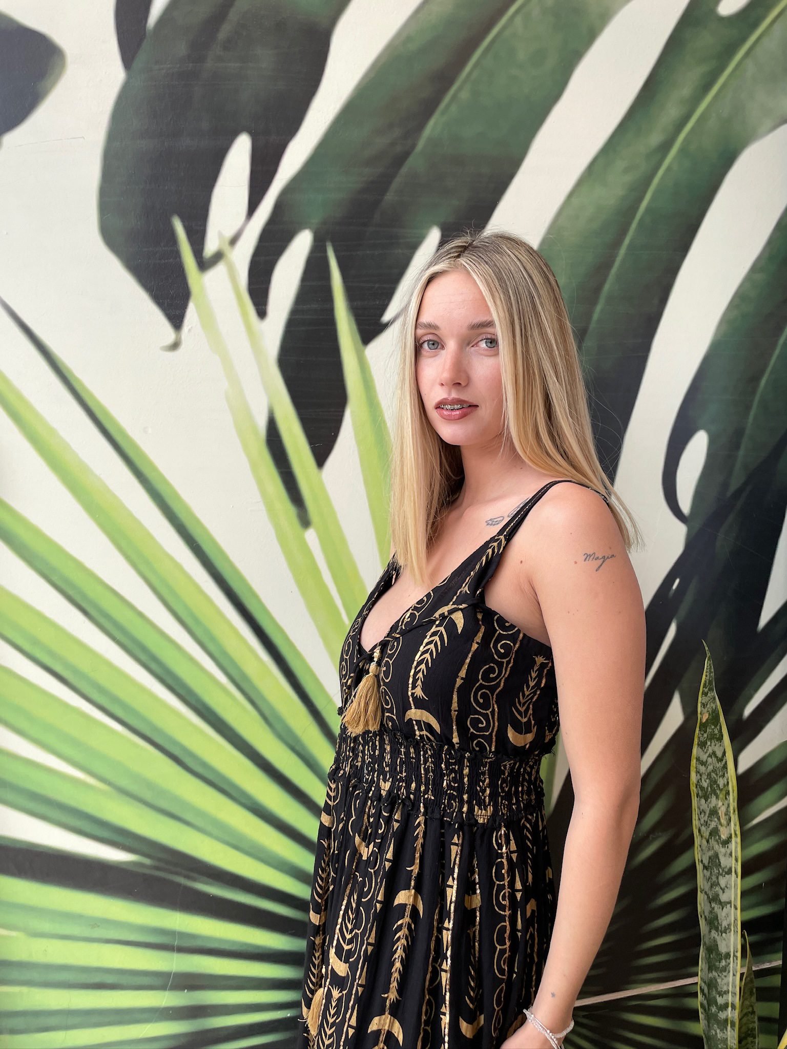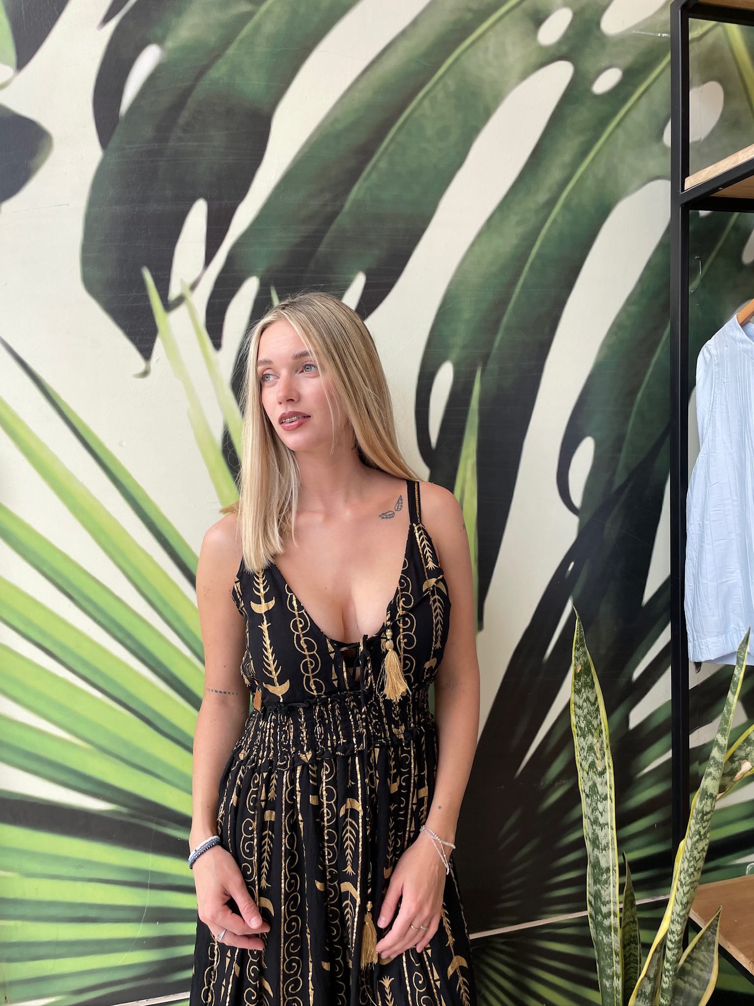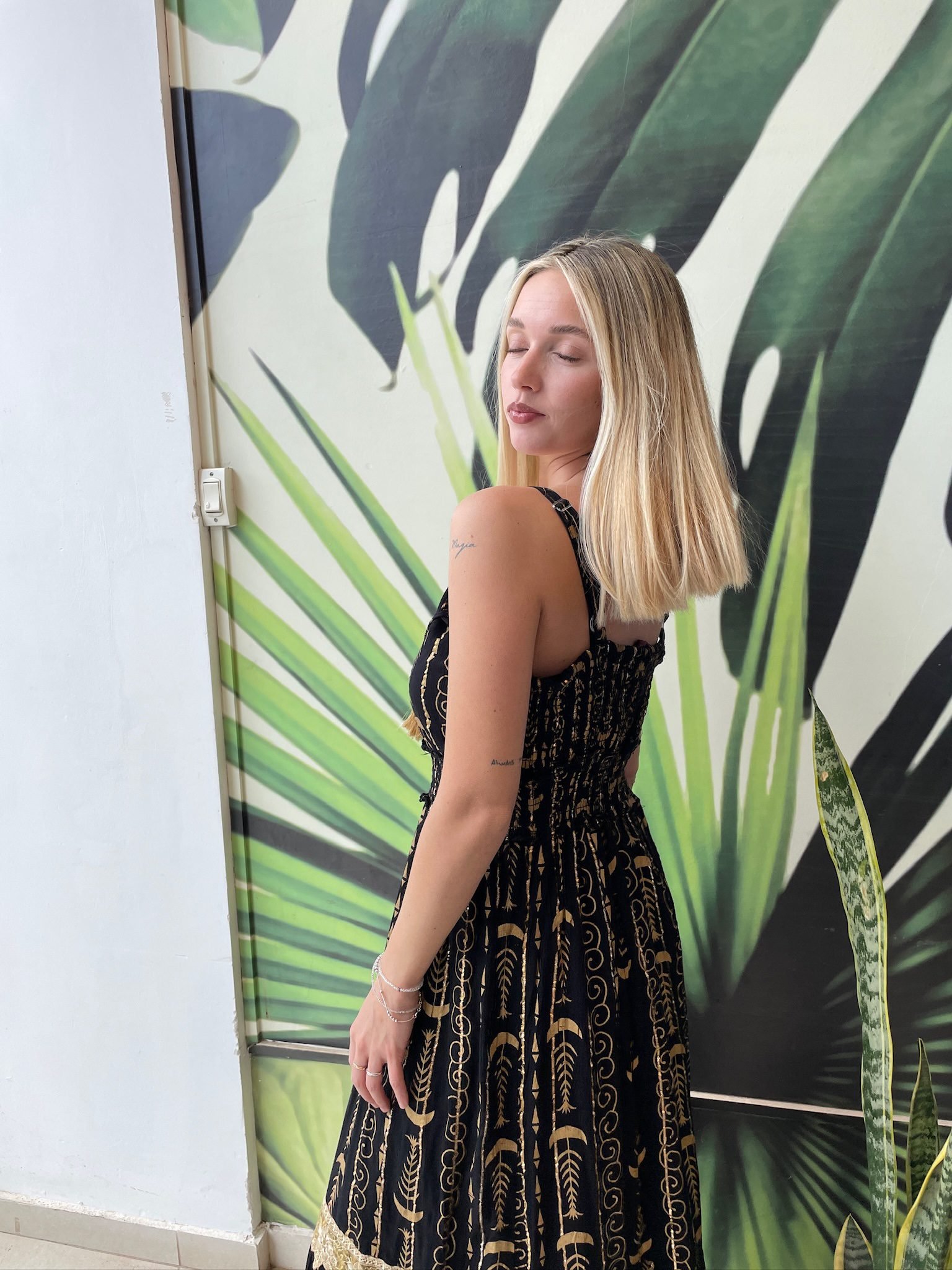 VESTIDO FRESCO CON UN ESTAMPADO ÚNICO, DETALLES BORDADOS EN DORADO Y FLECOS.